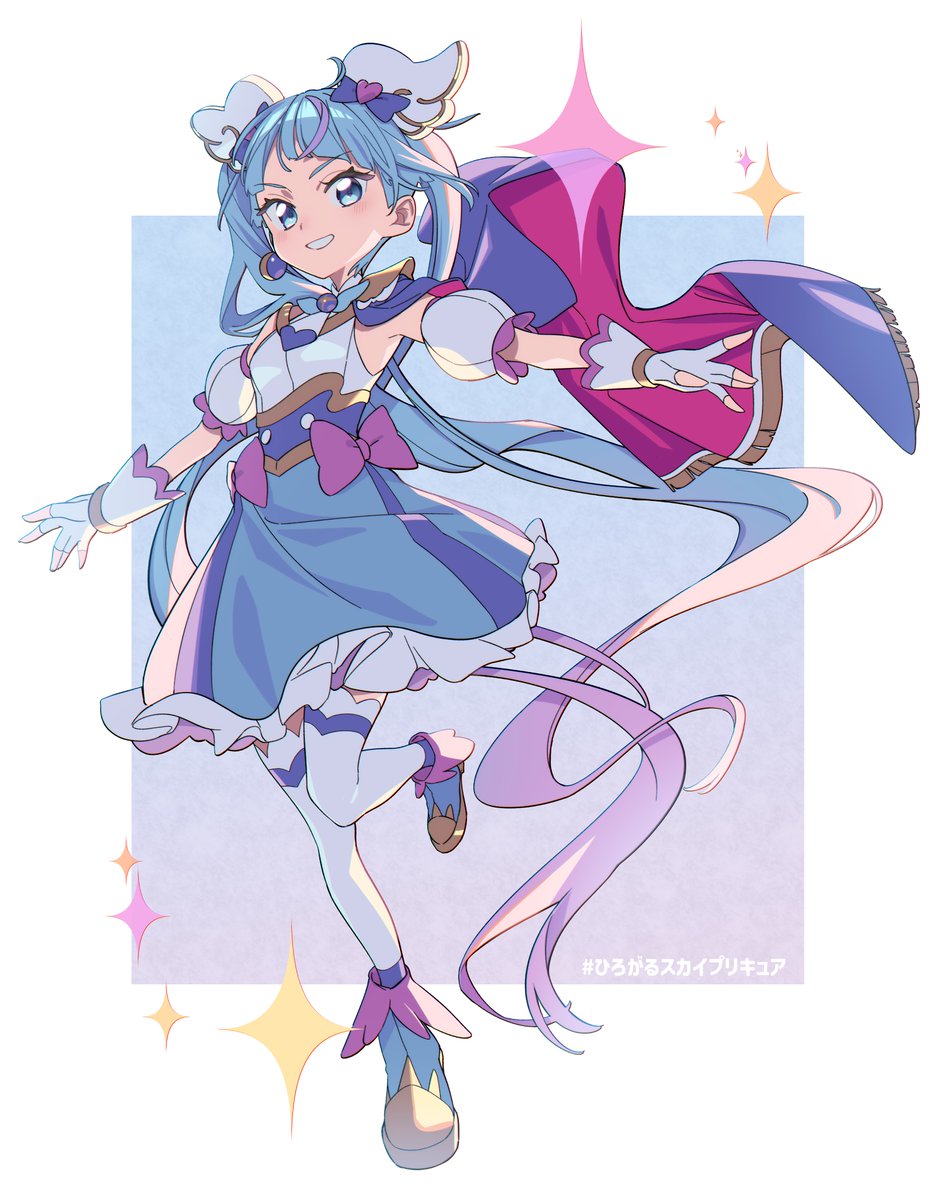 1girl ahoge blue_eyes blue_hair blue_skirt bow brooch cape commentary cure_sky detached_sleeves earrings fingerless_gloves full_body gloves grin hair_ornament highres hirogaru_sky!_precure jewelry magical_girl misao_koinu pink_bow precure puffy_detached_sleeves puffy_sleeves single_earring single_sidelock skirt smile solo sora_harewataru sparkle thighhighs two-sided_cape two-sided_fabric white_gloves white_thighhighs wing_brooch wing_hair_ornament