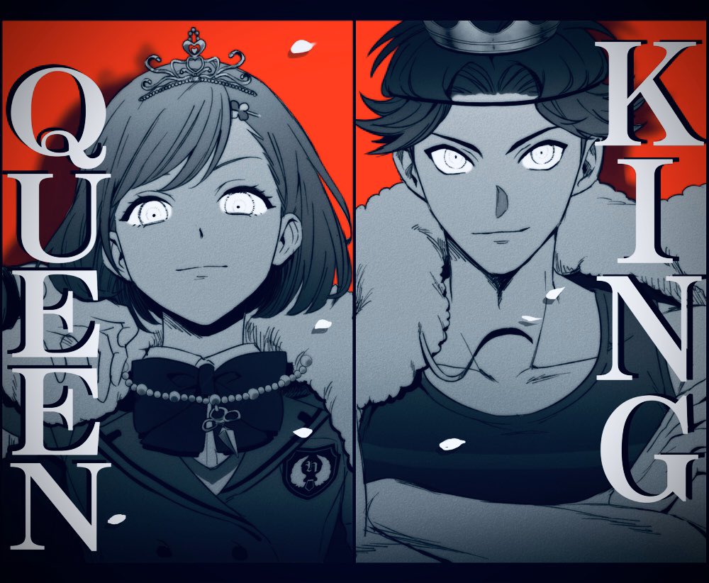 1boy 1girl badge beads bird blazer bob_cut buttons closed_mouth clover_hair_ornament column_lineup crossed_arms crow double-breasted english_text eyelashes gana_(mknumi) habataki_academy_school_uniform hair_flip hair_ornament hairclip hand_up headband jacket jewelry letterboxed long_sleeves monochrome on_throne pendant petals portrait protagonist_(tokimemo_gs4) red_background royal_robe sassa_nozomu school_uniform short_hair smile smirk smug throne tokimeki_memorial tokimeki_memorial_girl's_side tokimeki_memorial_girl's_side_4th_heart