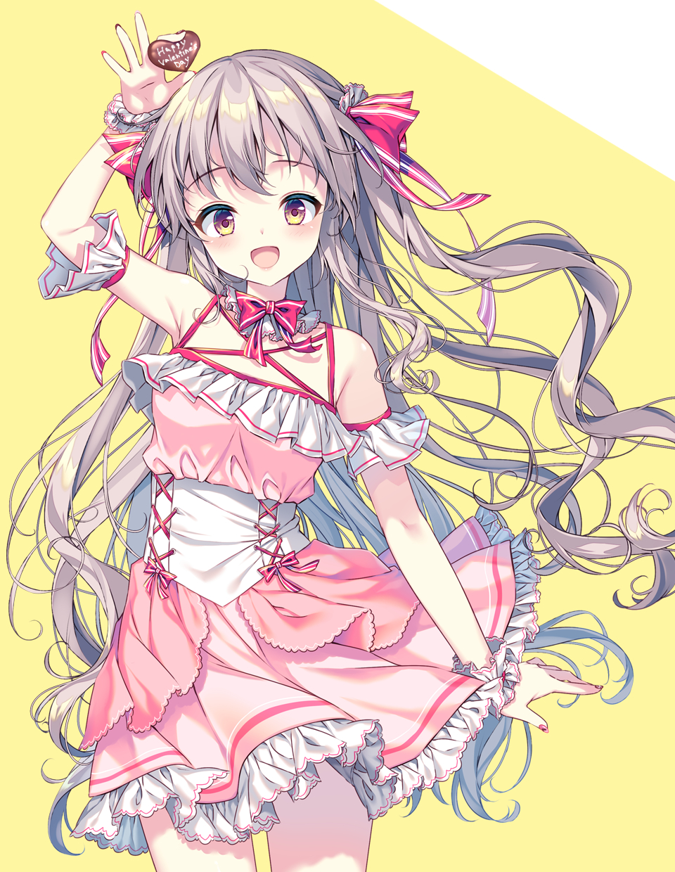 1girl :d arm_up bare_shoulders bow brown_eyes candy chocolate chocolate_heart commentary_request dress food frilled_dress frills grey_hair hair_bow happy_valentine heart highres holding holding_food long_hair looking_at_viewer mizuki_yuuma nail_polish open_mouth original pink_dress red_bow red_nails smile solo striped_bow two-tone_background two_side_up valentine very_long_hair white_background yellow_background