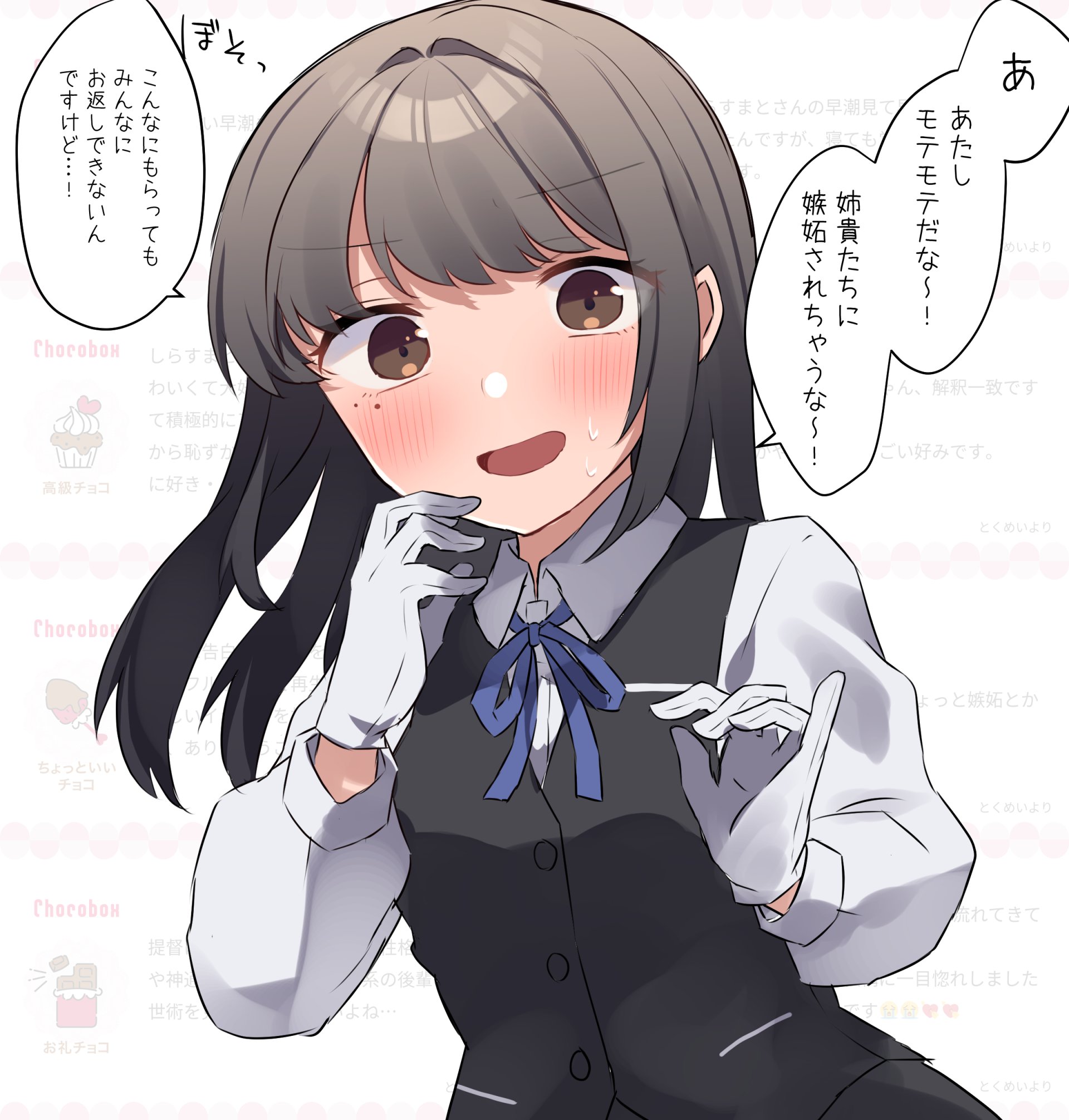 1girl adapted_costume black_hair black_vest blue_ribbon candy chocolate chocolate_bar collared_shirt commentary_request dress_shirt food gloves hayashio_(kancolle) highres kantai_collection long_hair long_sleeves mole mole_under_eye neck_ribbon red_eyes ribbon school_uniform shirasumato shirt smile solo translation_request vest white_gloves white_shirt