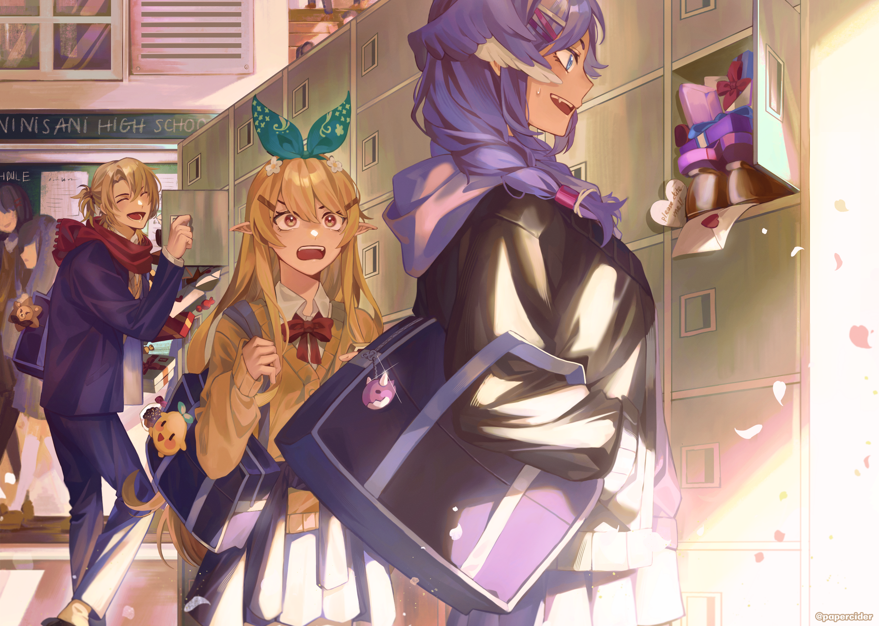 1boy 2girls ^_^ alternate_costume aqua_ribbon augustus_(luca_kaneshiro) black_cardigan blonde_hair blue_jacket blue_pants bow box brown_cardigan brown_vest cardigan closed_eyes collared_shirt dragoon_(selen_tatsuki) flower gift gift_box hair_flower hair_ornament hair_ribbon hairclip head_wings heart-shaped_box highres indoors jacket laughing letter locker long_hair long_pointy_ears love_letter luca_kaneshiro multiple_girls nijisanji nijisanji_en open_mouth pants papercider pointy_ears pomu_rainpuff pomudachi_(pomu_rainpuff) purple_hair red_bow red_scarf ribbon scarf school school_uniform selen_tatsuki selen_tatsuki_(1st_costume) shirt smile surprised sweatdrop twitter_username vest virtual_youtuber white_flower white_shirt wings