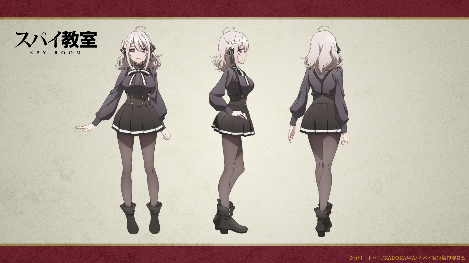 boots breasts grey_shirt highres large_breasts leggings lily_(spy_kyoushitsu) official_art ribbon shirt short_hair skirt spy_kyoushitsu tagme white_ribbon