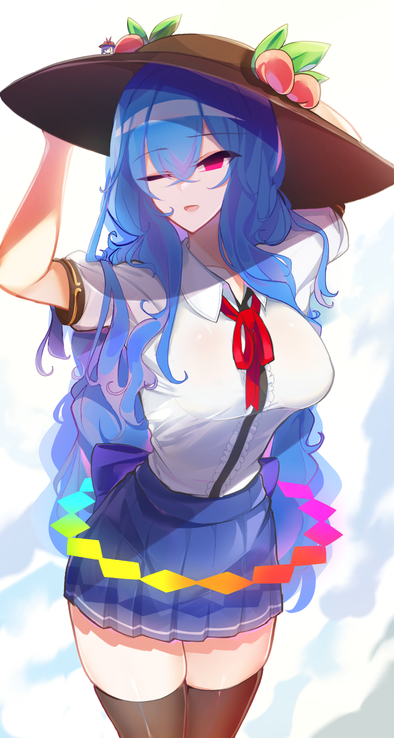 1girl black_hat blouse blue_bow blue_hair blue_skirt bow bowtie buttons chibi dress_shirt food frills fruit hat highres hinanawi_tenshi kaliningradg leaf long_hair miniskirt nagae_iku neck_ribbon one_eye_closed peach puffy_short_sleeves puffy_sleeves rainbow_order red_bow red_eyes ribbon shirt short_sleeves skindentation skirt solo thighhighs touhou white_shirt wing_collar zettai_ryouiki