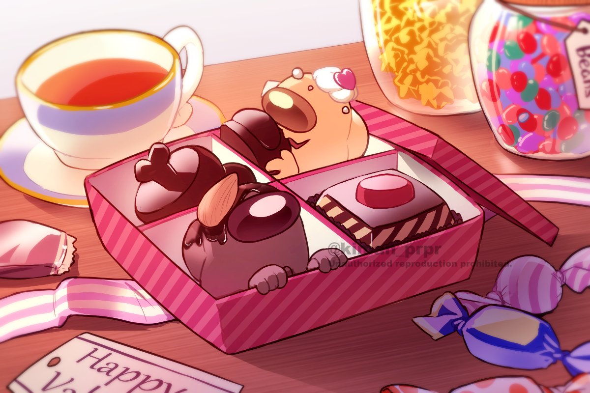 2others almond among_us artist_name banana_(among_us) box box_of_chocolates brown_(among_us) candy chocolate commentary_request crewmate_(among_us) cup dead_body_(among_us) eating food food_on_head happy_valentine impostor_(among_us) in_box in_container jar jelly_bean kiman multiple_others object_on_head open_mouth saucer simple_background table tea teacup twitter_username water white_background