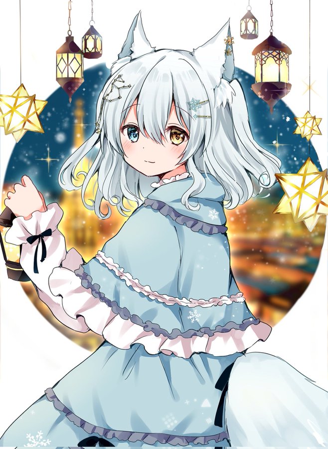 1girl :3 animal_ears blue_eyes blurry blurry_background blush capelet clothing_cutout commission constellation_hair_ornament dress fox_ears fox_girl fox_tail frilled_capelet frilled_dress frills from_behind glowing hair_ornament hairclip hanging_lantern heterochromia holding holding_lantern kokoshira_0510 lantern long_hair long_sleeves looking_at_viewer looking_back original ribbon skeb_commission sleeve_ribbon small_stellated_dodecahedron smile snowflake_hair_ornament solo tail tail_ornament tail_ribbon tail_through_clothes two_side_up virtual_youtuber white_hair yellow_eyes