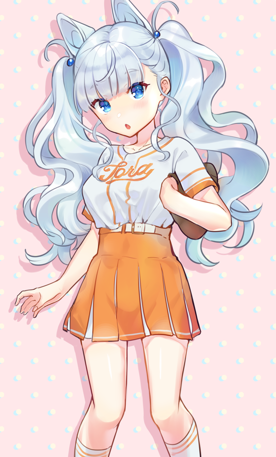 1girl arm_at_side baseball_glove baseball_uniform blue_eyes blunt_bangs collarbone curly_hair hair_ears kneehighs looking_at_viewer okanoyuno open_mouth orange_skirt polka_dot polka_dot_background skirt socks sportswear standing tenka_hyakken toragoze_no_tachi twintails white_hair