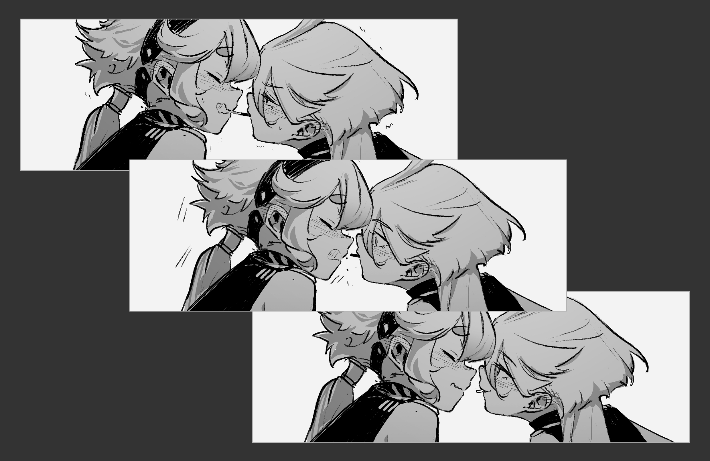 2girls ani_lu biting blush clenched_teeth closed_eyes comic ear_blush embarrassed face-to-face facing_another food food_in_mouth greyscale gundam gundam_suisei_no_majo half-closed_eyes highres leaning_forward long_hair looking_at_another miorine_rembran monochrome multiple_girls nose_blush pocky shared_food silent_comic smile suletta_mercury teeth trembling wavy_mouth yuri