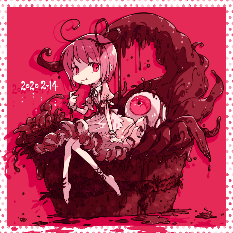 1girl :s :t arm_support barefoot border brown_hair cake cake_slice center_frills chocolate chocolate_cake closed_mouth corset dated dated_commentary dress dripping drop_shadow eating extra_arms eyeball food fork frilled_dress frilled_wristband frills full_body hair_ribbon hand_up holding holding_fork leg_ribbon looking_at_viewer monster neck_ribbon original oversized_object painttool_sai_(medium) pink_background pink_dress pink_eyes pink_hair pink_ribbon pink_theme plantar_flexion puddle puffy_short_sleeves puffy_sleeves rakuni ribbon short_hair short_sleeves sideways_glance simple_background sitting solo tentacles valentine white_border
