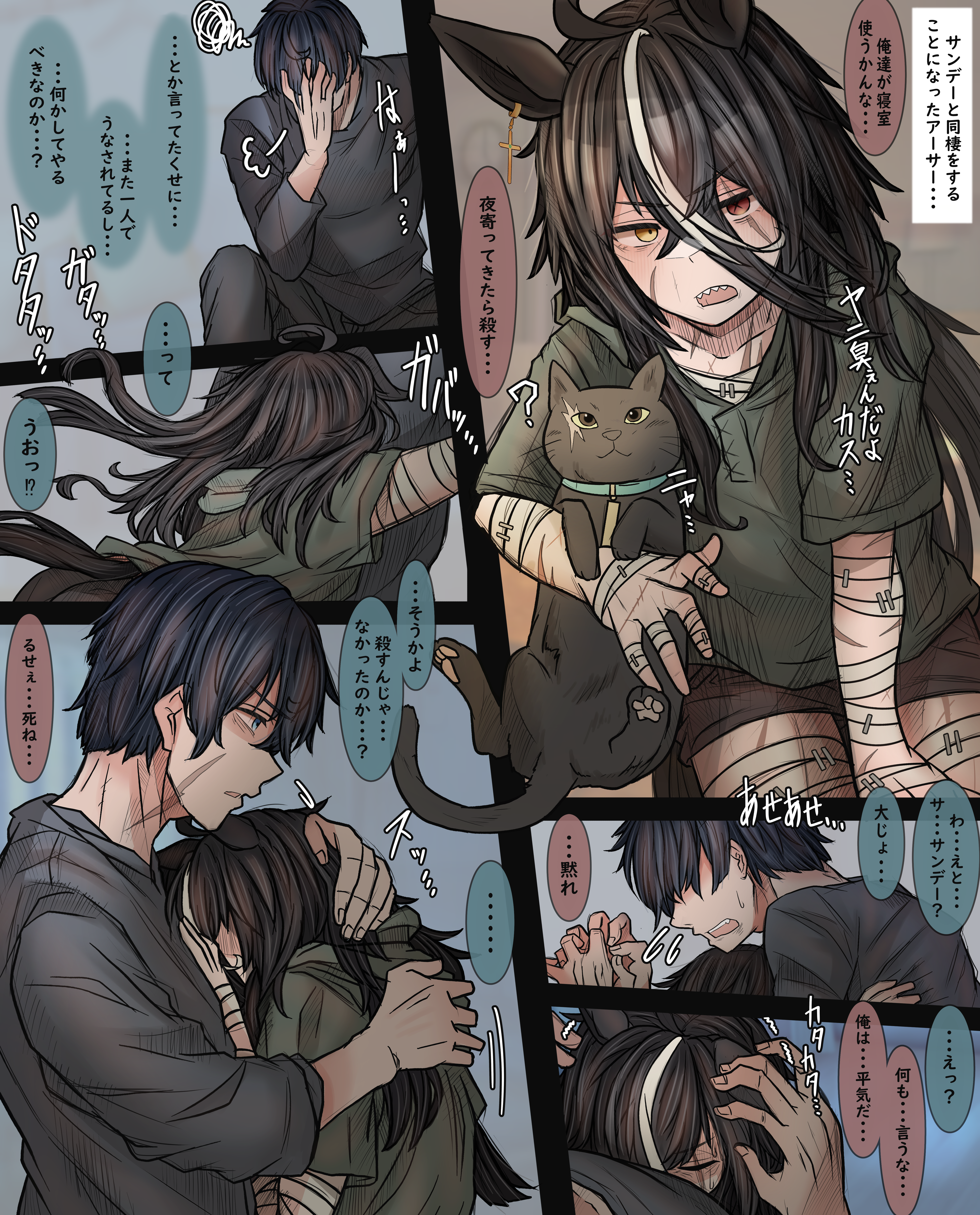 1boy 1girl ? absurdres ahoge animal animal_ears arthur_b._hancock_iii bandaged_arm bandaged_fingers bandaged_hand bandaged_leg bandages black_cat black_hair black_shirt blue_eyes blurry blurry_background cat collarbone comic commentary_request cross cross_earrings earrings facepalm facial_scar flying_sweatdrops genderswap genderswap_(mtf) green_hoodie heterochromia highres holding holding_animal holding_cat hood hoodie horse_ears horse_girl hug jewelry leogust long_bangs long_hair long_sleeves multicolored_hair multiple_scars narration original outside_border personification red_eyes scar scar_across_eye scar_on_cheek scar_on_face scar_on_leg scar_on_neck shirt short_hair sigh single_earring speech_bubble squiggle streaked_hair sunday_silence_(racehorse) translation_request two-tone_hair umamusume visible_air white_hair yellow_eyes
