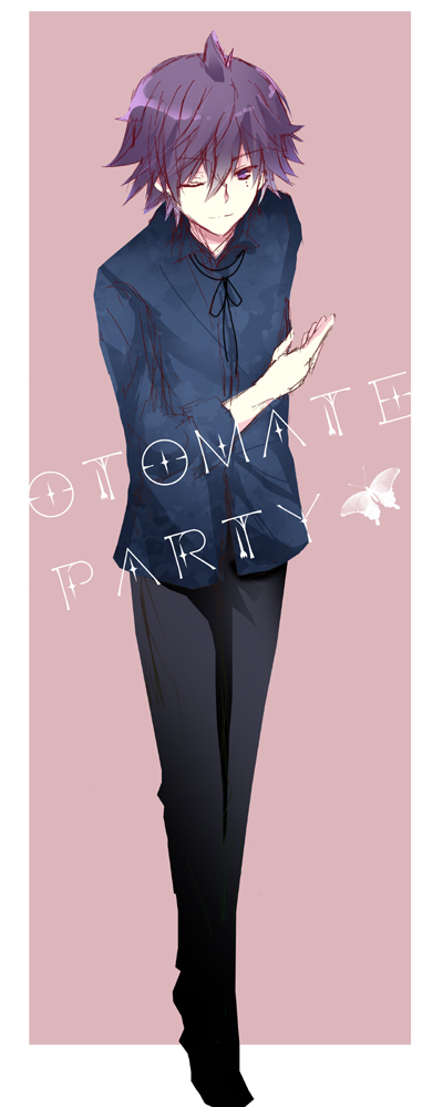 1boy black_pants blue_shirt border full_body hikage_(kokuchou_no_psychedelica) houkiri_nemu kokuchou_no_psychedelica long_sleeves looking_at_viewer male_focus mole mole_under_eye pants purple_background purple_eyes purple_hair shirt solo white_border