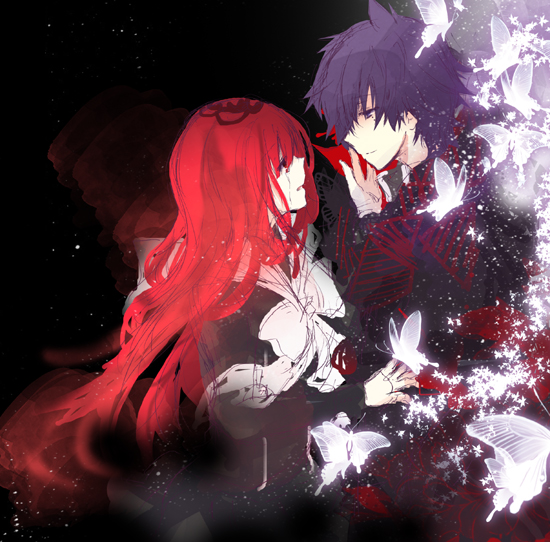 1boy 1girl beniyuri_(kokuchou_no_psychedelica) black_background black_serafuku bug butterfly facing_another hetero hikage_(kokuchou_no_psychedelica) houkiri_nemu insect kokuchou_no_psychedelica long_hair long_sleeves purple_eyes purple_hair red_eyes red_hair school_uniform serafuku short_hair white_butterfly