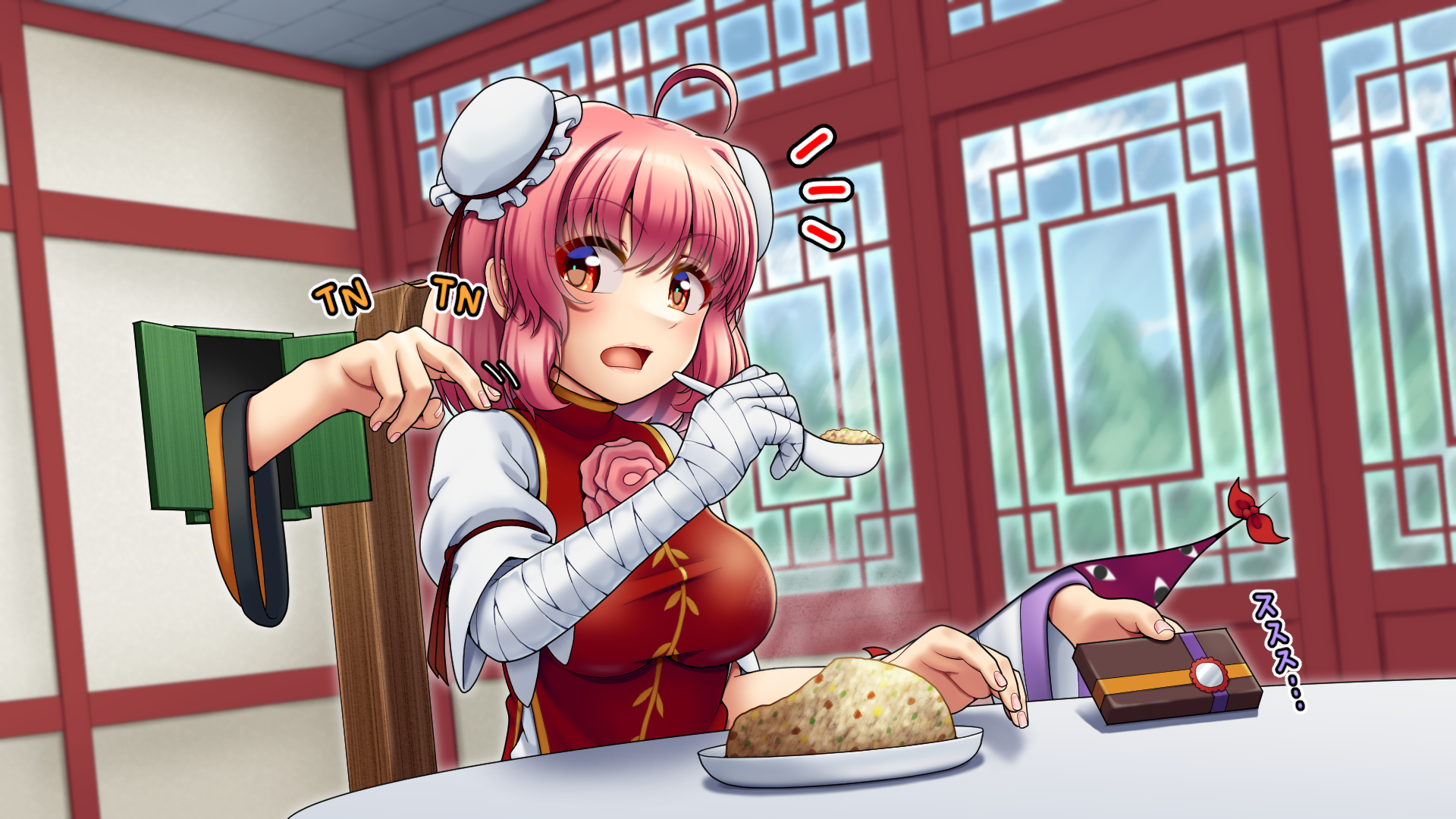 3girls ahoge bad_source bandaged_arm bandages breasts bun_cover chocolate double_bun eating food fried_rice gap_(touhou) hair_bun highres holding holding_spoon ibaraki_kasen large_breasts matara_okina multiple_girls pink_hair red_eyes sages_of_gensokyo_(touhou) short_sleeves spoon tabard table tatsu_toyoyo teamwork touhou valentine wide_sleeves window yakumo_yukari