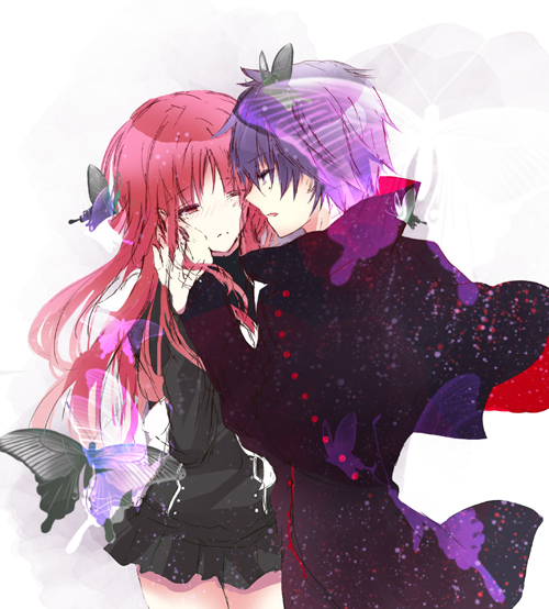 1boy 1girl beniyuri_(kokuchou_no_psychedelica) black_jacket facing_another hetero hikage_(kokuchou_no_psychedelica) houkiri_nemu jacket kokuchou_no_psychedelica long_hair long_sleeves purple_eyes purple_hair red_eyes red_hair short_hair sketch white_background