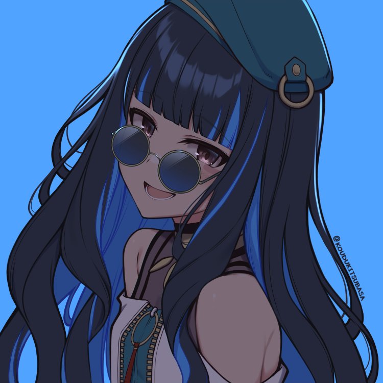 1girl beret black_hair blue_background blue_hair colored_inner_hair fate/grand_order fate_(series) grey_eyes hat kouzuki_tsubasa_(musou_kaidou) long_hair multicolored_hair smile sunglasses tenochtitlan_(fate) tenochtitlan_(second_ascension)_(fate) twitter_username zipper