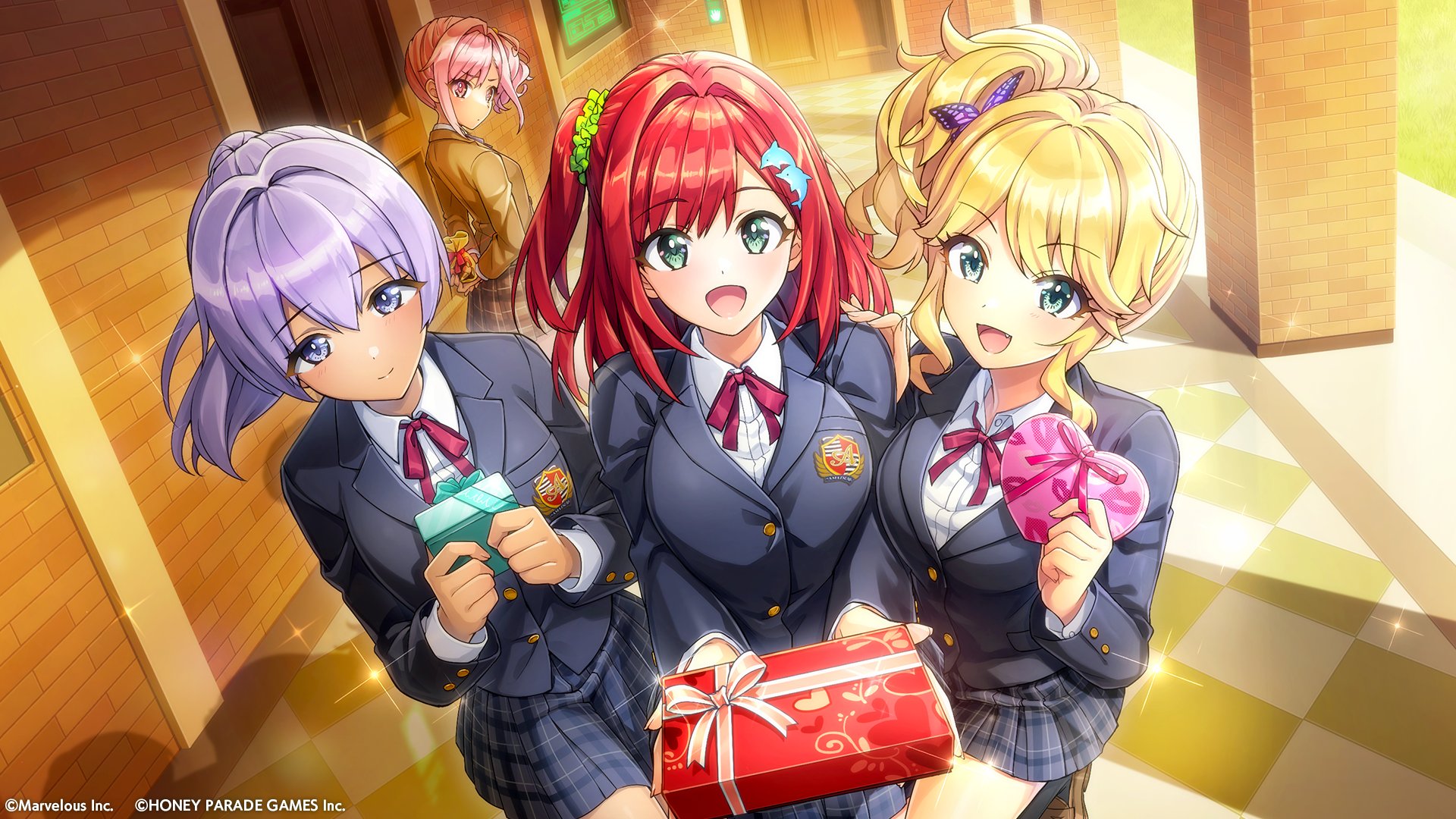 4girls blonde_hair blue_eyes box collared_shirt dark-skinned_female dark_skin dolphin_wave fang fang_out gift gift_box green_eyes gyaru hair_ornament highres holding holding_gift izumi_kiri light_smile looking_at_viewer multiple_girls official_art ootomo_takuji open_mouth pink_eyes pink_hair pleated_skirt ponytail purple_hair red_hair sakimiya_iruka school_uniform shirt short_hair side_ponytail skirt smile souma_hayate urami_kana valentine
