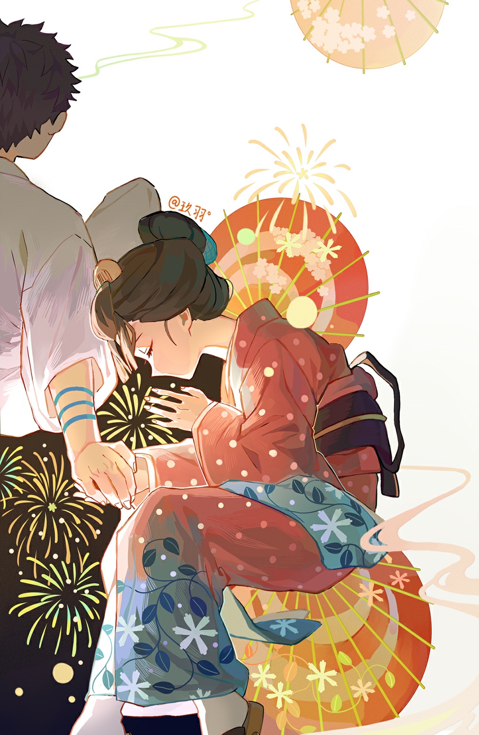 1boy 1girl aerial_fireworks artist_name black_hair blue_kimono closed_eyes facing_away feet_out_of_frame fireworks grey_pants hair_bun hair_ornament hair_pulled_back hakuji_(kimetsu_no_yaiba) highres holding_hands invisible_chair japanese_clothes jiuyu0 kimetsu_no_yaiba kimono koyuki_(kimetsu_no_yaiba) long_sleeves lying night nihongami oil-paper_umbrella on_side pants pink_kimono polka_dot polka_dot_kimono profile sandals short_hair single_hair_bun sitting sky smoke tabi two-tone_kimono umbrella updo vine_print white_background wide_sleeves zouri