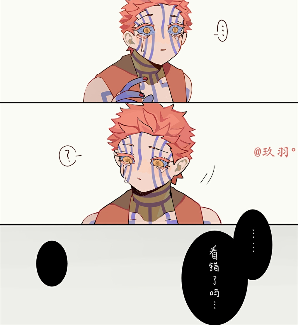 ... 1boy ? akaza_(kimetsu_no_yaiba) artist_name bare_shoulders colored_eyelashes comic crying crying_with_eyes_open eyelashes facial_mark facial_tattoo full-body_tattoo jiuyu0 kimetsu_no_yaiba looking_away looking_down looking_to_the_side male_focus new_year pink_hair portrait red_nails sad short_hair sleeveless speech_bubble spoken_ellipsis spoken_question_mark tattoo tears text_in_eyes translation_request wide-eyed
