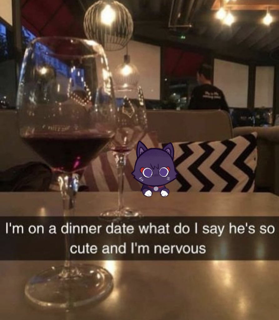 alcohol black_cat booth_seating cat chair collar cup drinking_glass english_text eyeshadow genshin_impact light_bulb makeup pastahands pillow purple_eyes real_life_insert red_collar red_eyeshadow restaurant scaramouche_(cat)_(genshin_impact) scaramouche_(genshin_impact) table waiter wine wine_glass