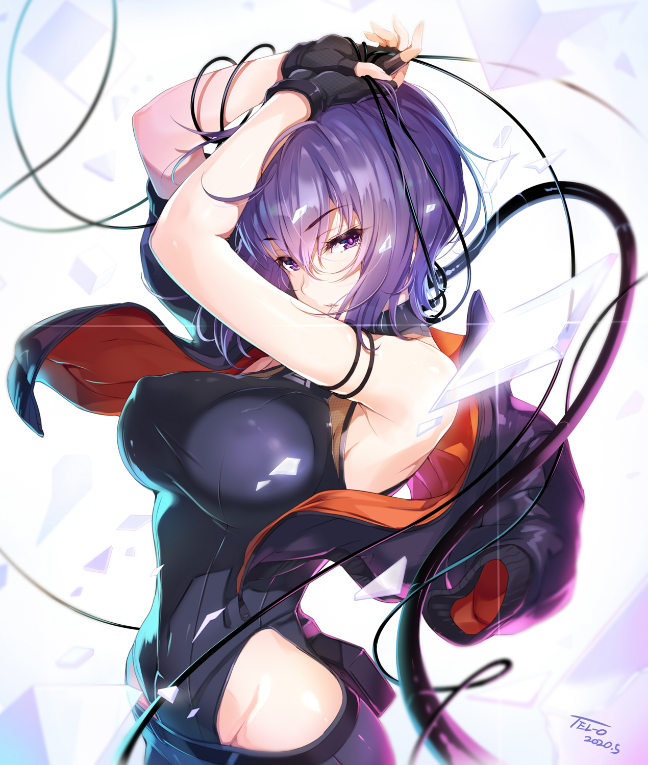 1girl arms_up black_gloves black_leotard breasts covered_navel curvy cyborg fingerless_gloves ghost_in_the_shell ghost_in_the_shell:_sac_2045 gloves hair_between_eyes highleg highleg_leotard highres kusanagi_motoko large_breasts leotard leotard_under_clothes lips looking_at_viewer looking_back medium_hair pants purple_eyes purple_hair shiny_clothes shiny_skin simple_background sleeveless solo tel-o wide_hips wire