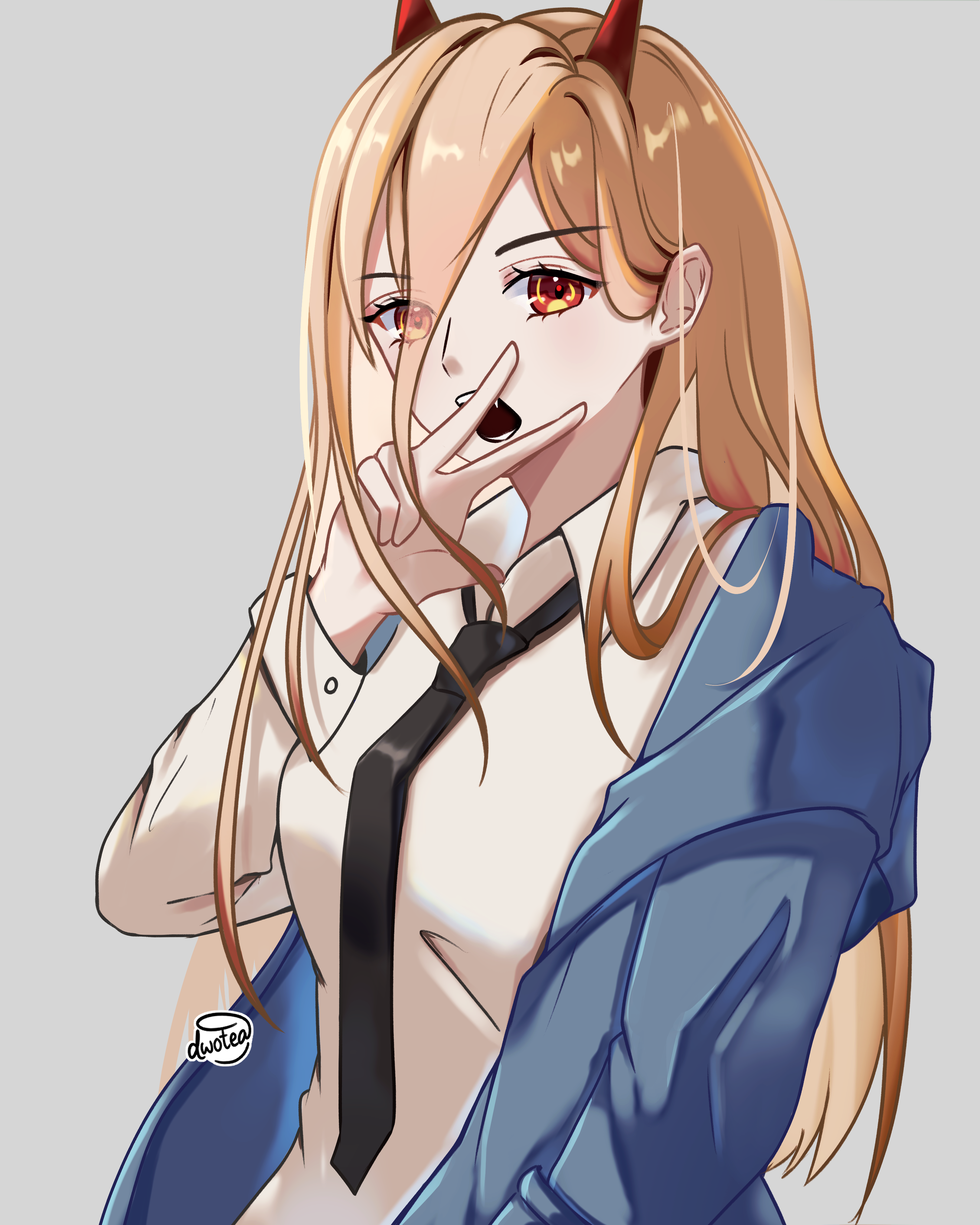1girl :o absurdres artist_logo artist_name blue_jacket breasts chainsaw_man collared_shirt commentary covering_own_mouth demon_girl demon_horns dress_shirt dwotea english_commentary eyelashes eyes_visible_through_hair fang grey_background hair_behind_ear hair_between_eyes hair_over_shoulder hand_over_own_mouth highres hood hood_down hooded_jacket horns jacket jacket_on_shoulders light_brown_hair logo long_bangs long_hair long_sleeves looking_at_viewer loose_necktie medium_breasts necktie open_mouth orange_hair power_(chainsaw_man) shirt simple_background solo teeth upper_body v white_shirt