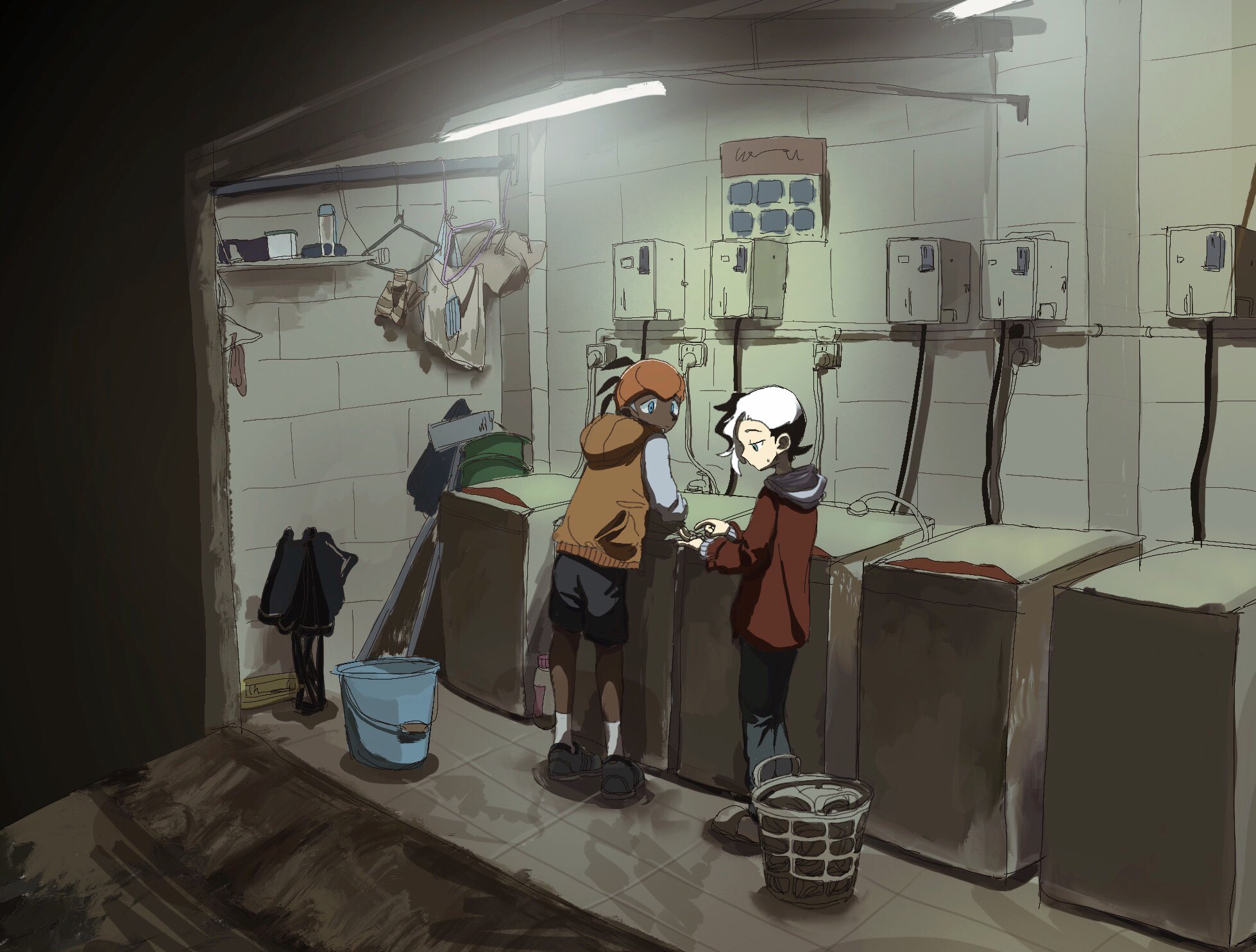 2boys black_hair black_shorts blue_eyes bucket closed_mouth dark-skinned_male dark_skin dr_mice headband highres hood hood_down laundry long_sleeves male_focus multiple_boys nintendo orange_headband pants piers_(pokemon) pokemon pokemon_sword_and_shield raihan_(pokemon) shorts standing sweat top-load_washing_machine washing_machine white_hair