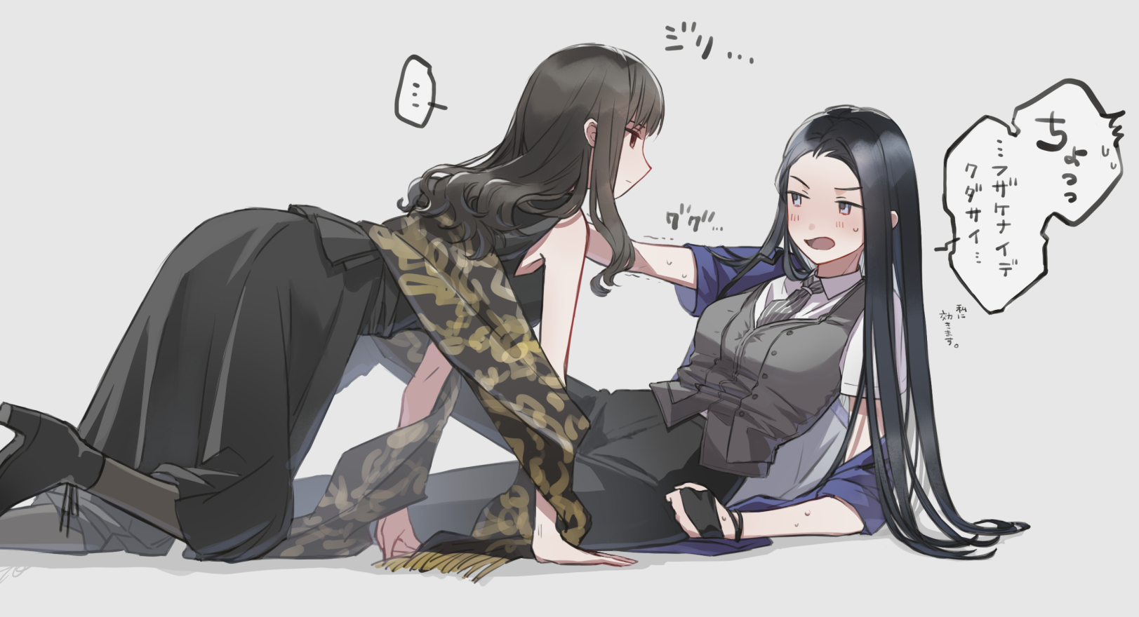... 2girls all_fours ankle_boots arm_support bare_arms bare_shoulders black_footwear black_gloves black_hair black_pants black_shirt black_skirt blue_eyes blue_jacket blush boots breasts brown_hair buttons closed_mouth collared_shirt expressionless eye_contact fingerless_gloves from_side gloves grey_background grey_necktie grey_pantyhose grey_vest half_gloves hand_up high_heel_boots high_heels highres jacket jitome leaning_back long_hair long_skirt looking_at_another medium_breasts multiple_girls necktie off_shoulder open_clothes open_jacket open_mouth pants pantyhose parted_bangs profile pushing raised_eyebrow shadow shawl shirt shoe_soles short_sleeves shoujo_kageki_revue_starlight sidelocks simple_background sitting skirt sleeveless sleeveless_shirt souda_sawa_(revue_starlight) speech_bubble spoken_ellipsis spoken_sweatdrop striped_clothes striped_necktie sweat sweatdrop tareko translated trembling vertical-striped_clothes vertical-striped_necktie very_long_hair vest wavy_hair white_shirt yakumo_kyouko yuri