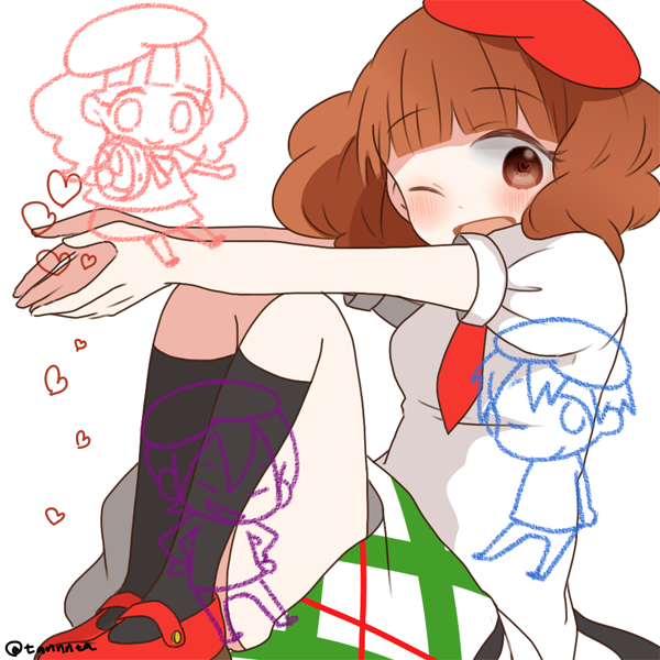 1girl bemani black_socks blunt_bangs brown_hair dot_nose necktie one_eye_closed open_mouth pop'n_music puffy_sleeves red_footwear rie-chan ritard shirt simple_background sitting skirt socks solo white_background white_shirt