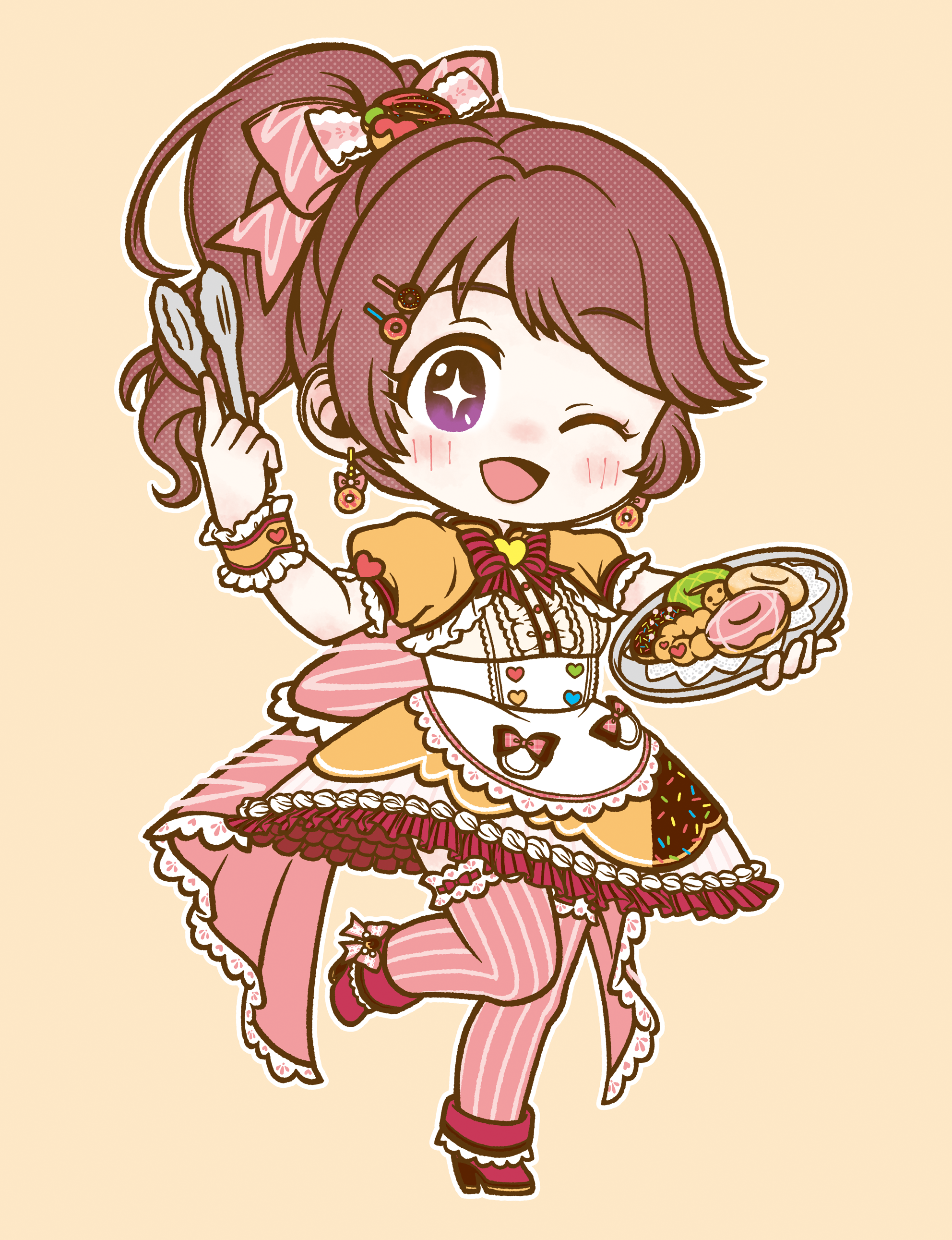 1girl absurdres blush brown_hair donut donut_earrings dress earrings food food-themed_earrings food-themed_hair_ornament hair_ornament hairclip high_heels highres holding holding_tongs idolmaster idolmaster_cinderella_girls idolmaster_cinderella_girls_starlight_stage jewelry open_mouth ponytail shiina_noriko short_sleeves solo sparkling_eyes sprinkles standing standing_on_one_leg striped_clothes striped_thighhighs syoko66 thighhighs tongs vertical-striped_clothes vertical-striped_thighhighs wrist_cuffs