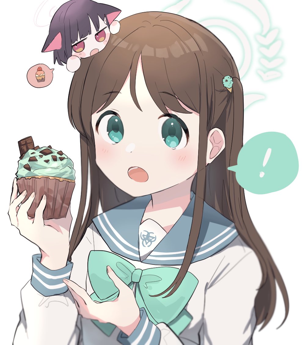 ! 2girls airi_(blue_archive) aqua_bow aqua_bowtie blue_archive blue_sailor_collar bow bowtie brown_hair chibi cupcake food food-themed_hair_ornament hair_ornament halo holding holding_food ice_cream_hair_ornament kazusa_(blue_archive) long_hair long_sleeves looking_at_viewer multiple_girls open_mouth sailor_collar school_uniform serafuku simple_background solo_focus spoken_exclamation_mark upper_body white_background white_serafuku wotakana_s