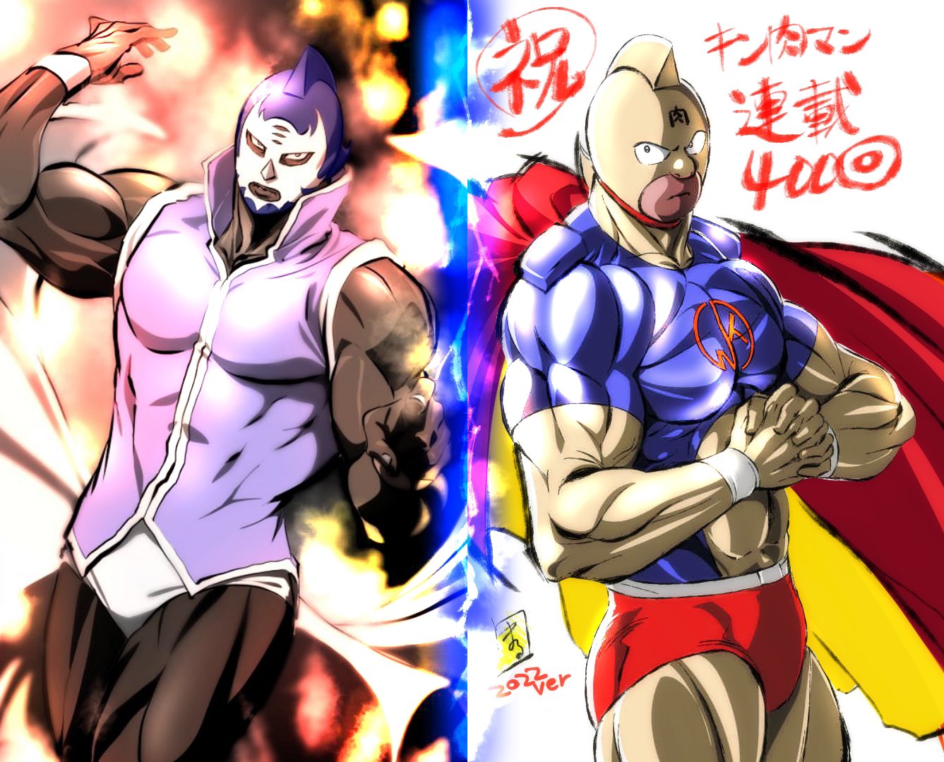 2022 2boys abs anniversary biceps cape clenched_hand dark_skin dated kinniku_suguru kinnikuman kinnikuman_(character) kinnikuman_mariposa large_pectorals looking_at_viewer manly marufuji_hirotaka mask multiple_boys muscular pectorals serious wrestling wrestling_mask wrestling_outfit