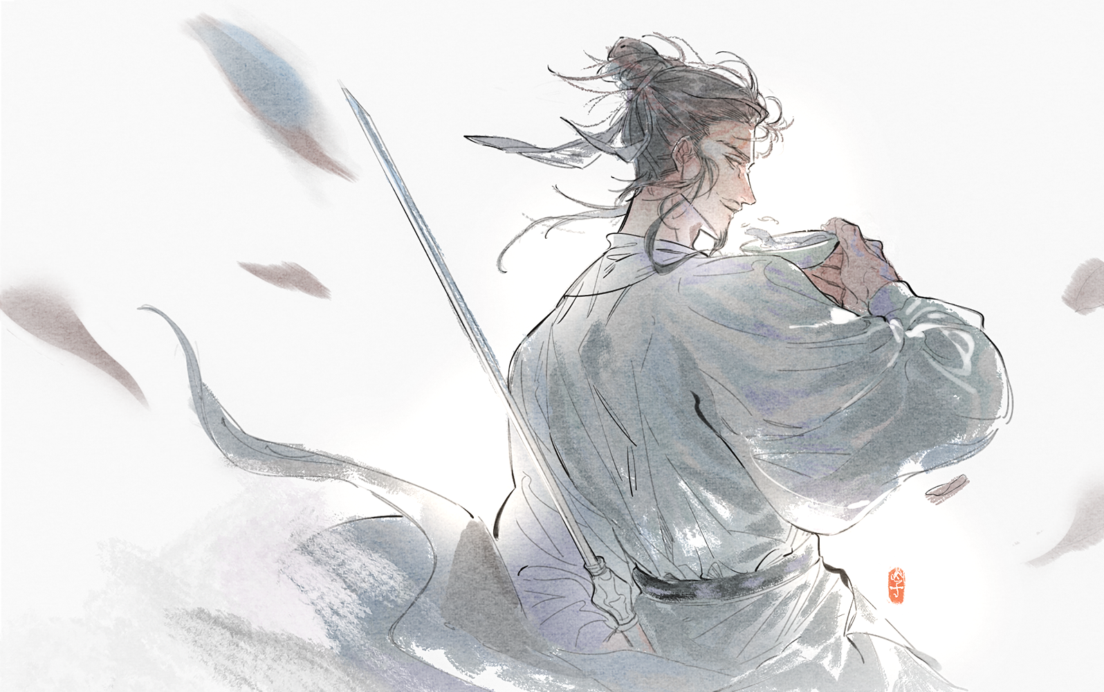 1boy alcohol arm_behind_back chinese_clothes cup facial_hair floating_clothes floating_hair from_behind goatee hair_bun hand_up hanfu holding holding_cup holding_sword holding_weapon jian_(weapon) jiangnan_baijingtu li_bai long_sleeves looking_at_viewer male_focus mustache profile reverse_grip robe sash sideways_glance simple_background single_hair_bun smile solo sword updo upper_body weapon white_background white_robe white_theme wind yinertang