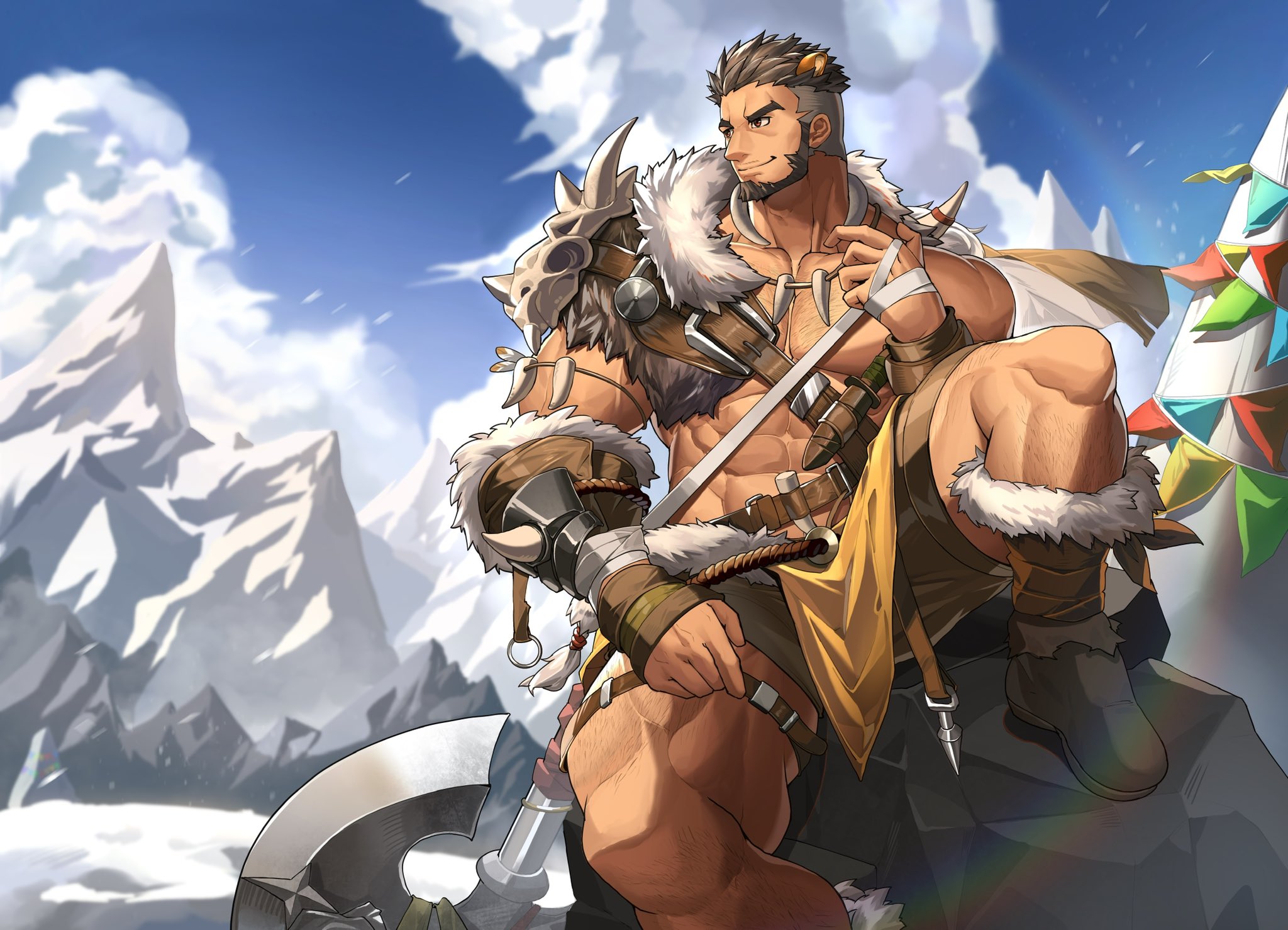 &{ID:8246108 CreatedAt:Thu Feb 16 16:00:45 -0600 2023 Score:2 Width:2048 Height:1478 MD5:18cab70c83bfc5281ac355aa1a12b855 Directory:18/ca Image:18cab70c83bfc5281ac355aa1a12b855.jpg Rating:general Source:https://twitter.com/TekkoWang/status/1575840401704878082 Change:1765396868 Owner:danbooru CreatorID:6498 ParentID:0 Sample:1 PreviewHeight:252 PreviewWidth:350 Tags:1boy abs alca_(wakatanka4) alternate_costume animal_ears armor axe bandages bara battle_axe beard black_hair blue_sky bracer brown_shorts chest_hair cloud cloudy_sky facial_hair foot_out_of_frame fur_trim gyee highres jewelry large_pectorals leg_belt leg_hair lion_boy lion_ears lion_tail looking_to_the_side male_focus mature_male mountain muscular muscular_legs muscular_male navel necklace original outdoors pauldrons pectorals pelvic_curtain rainbow rock shoes short_hair shorts shoulder_armor single_pauldron sitting sky smirk solo spread_legs stomach tail tekkowang thick_eyebrows thighs tooth_necklace undercut weapon Title: HasNotes:false HasComments:false FileURL:https://img2.gelbooru.com/images/18/ca/18cab70c83bfc5281ac355aa1a12b855.jpg PreviewURL:https://gelbooru.com/thumbnails/18/ca/thumbnail_18cab70c83bfc5281ac355aa1a12b855.jpg SampleURL:https://img2.gelbooru.com/samples/18/ca/sample_18cab70c83bfc5281ac355aa1a12b855.jpg SampleHeight:613 SampleWidth:850 Status:active PostLocked:0 HasChildren:false IsVideo:false DisplayDate:16.02.2023 16:00}