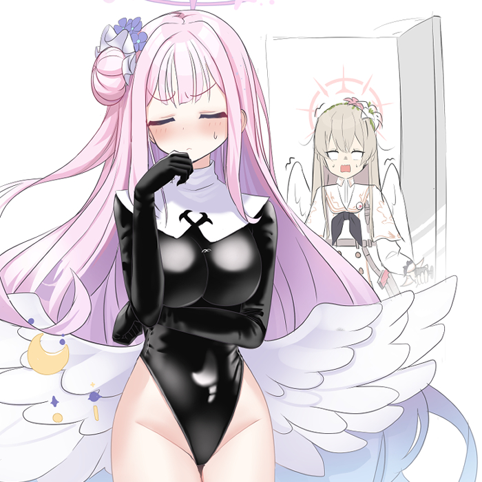 2girls blonde_hair blue_archive blue_hair blush breasts closed_eyes cosplay embarrassed gradient_hair hair_bun hair_ornament justina_follower_(blue_archive) large_breasts latex latex_leotard leotard long_hair low_wings mika_(blue_archive) multicolored_hair multiple_girls nagisa_(blue_archive) petals pink_hair scrunchie shooka single_hair_bun solo_focus surprised thighs wide-eyed wide_hips wings