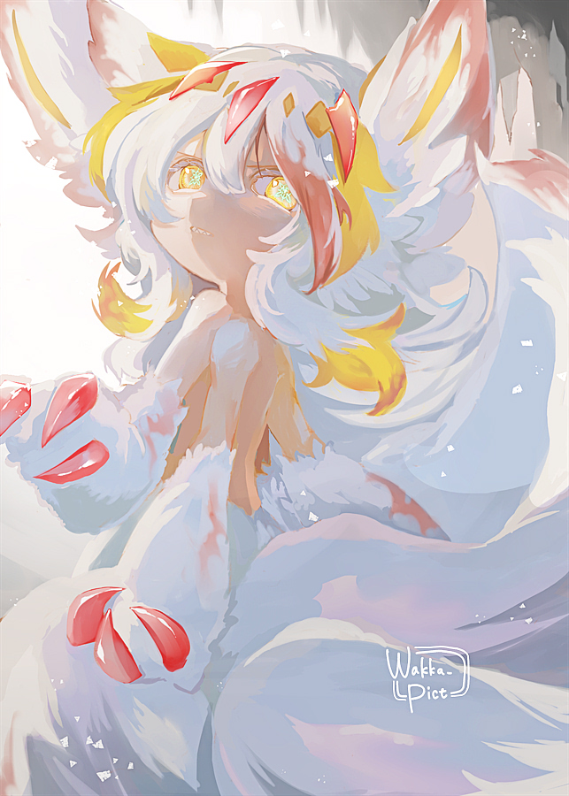 1girl animal_ears blonde_hair blood blood_in_hair blood_on_hands body_fur claws clenched_teeth commentary cowboy_shot dark-skinned_female dark_skin extra_arms faputa fewer_digits from_side hair_between_eyes horns looking_to_the_side made_in_abyss medium_hair monster_girl multicolored_hair multiple_horns multiple_tails red_horns rekoku serious sharp_teeth sideways_glance signature solo streaked_hair tail teeth two-tone_hair v-shaped_eyebrows white_fur white_hair yellow_eyes