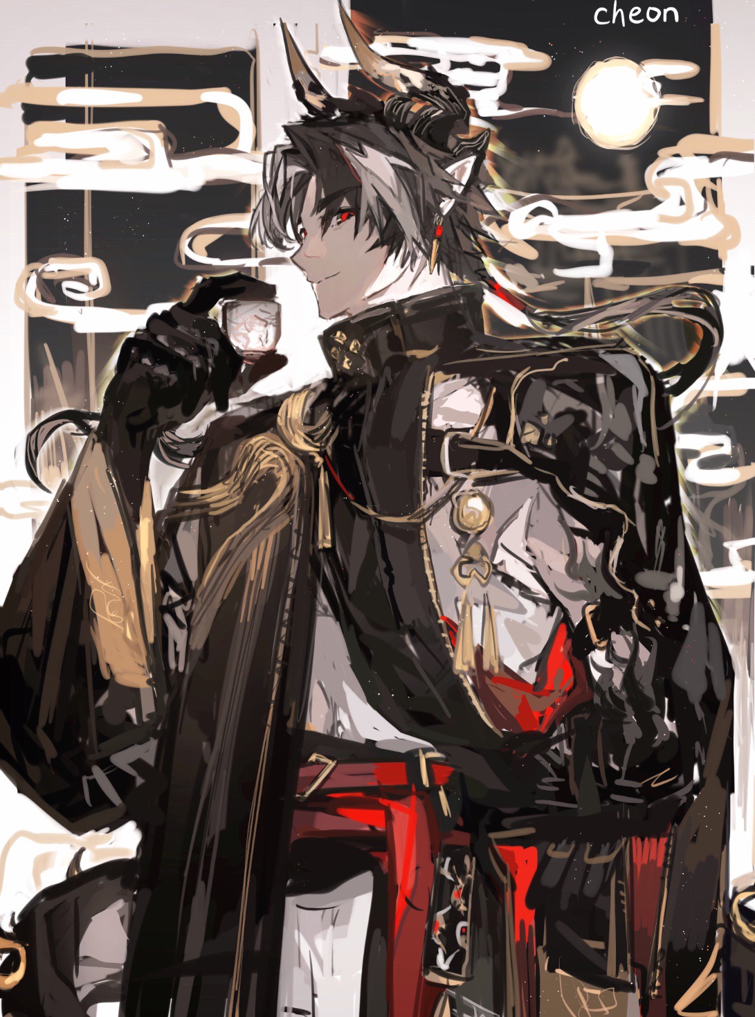 1boy arknights artist_name black_hair black_skin chinese_commentary chongyue_(arknights) closed_mouth colored_skin commentary_request cowboy_shot cup dragon_horns earrings floating_hair hand_up highres holding holding_cup horns jewelry long_hair long_sleeves looking_at_viewer low_ponytail male_focus multicolored_hair pointy_ears ponytail red_eyes shirt shorts sideways_glance smile solo streaked_hair supercalifraglistcexpialidocio tassel white_hair white_shirt white_shorts