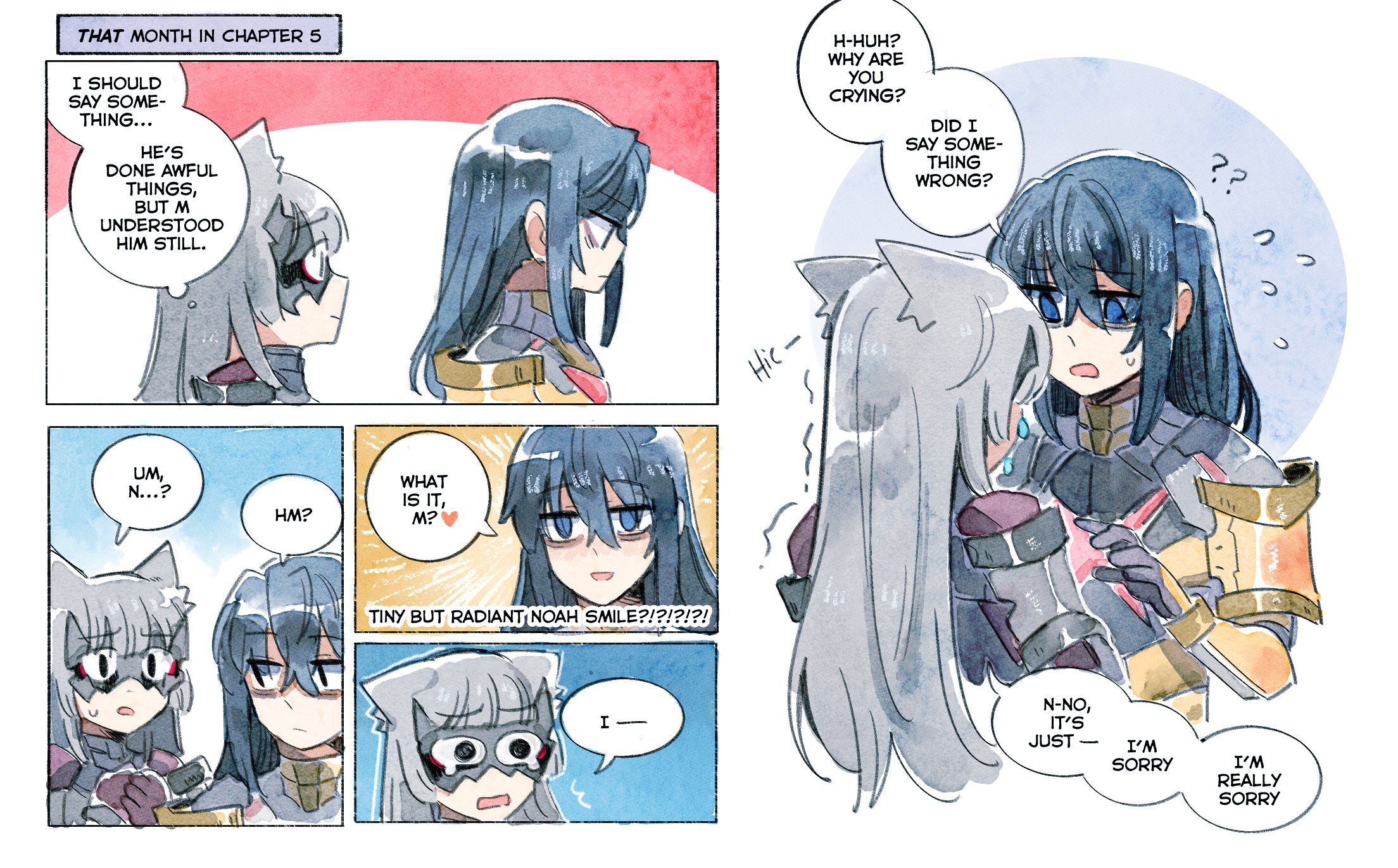 1boy 1girl ange_(angeban93) animal_ears armor bags_under_eyes black_hair cat_ears comic english_text grey_hair highres light_smile long_hair m_(xenoblade) n_(xenoblade) speech_bubble spoilers tearing_up xenoblade_chronicles_(series) xenoblade_chronicles_3