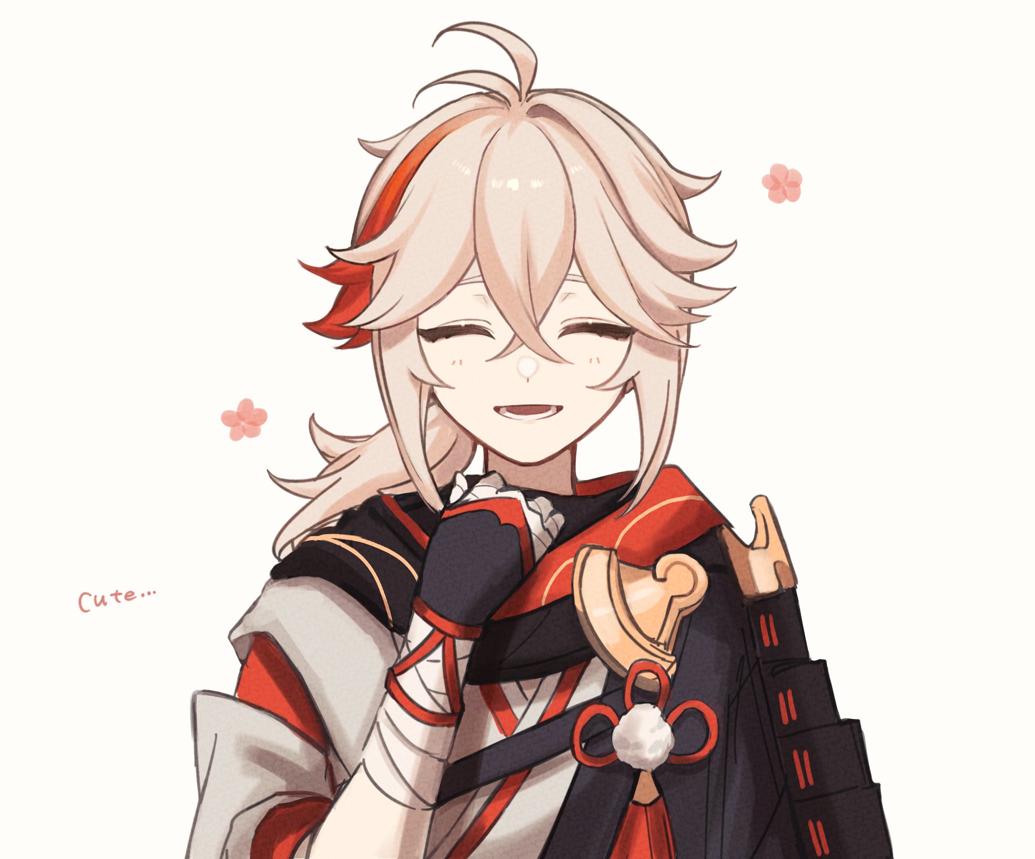 1boy 39_iduki :d ^_^ antenna_hair armor bandaged_arm bandaged_hand bandages black_gloves black_scarf blush closed_eyes commentary_request crossed_bangs english_text fingerless_gloves genshin_impact gloves grey_hair hair_between_eyes hand_up highres japanese_armor japanese_clothes kaedehara_kazuha kimono laughing low_ponytail male_focus medium_hair multicolored_hair open_mouth pom_pom_(clothes) ponytail red_hair red_scarf scarf short_sleeves shoulder_armor sidelocks simple_background smile sode solo streaked_hair tassel teeth upper_body white_background