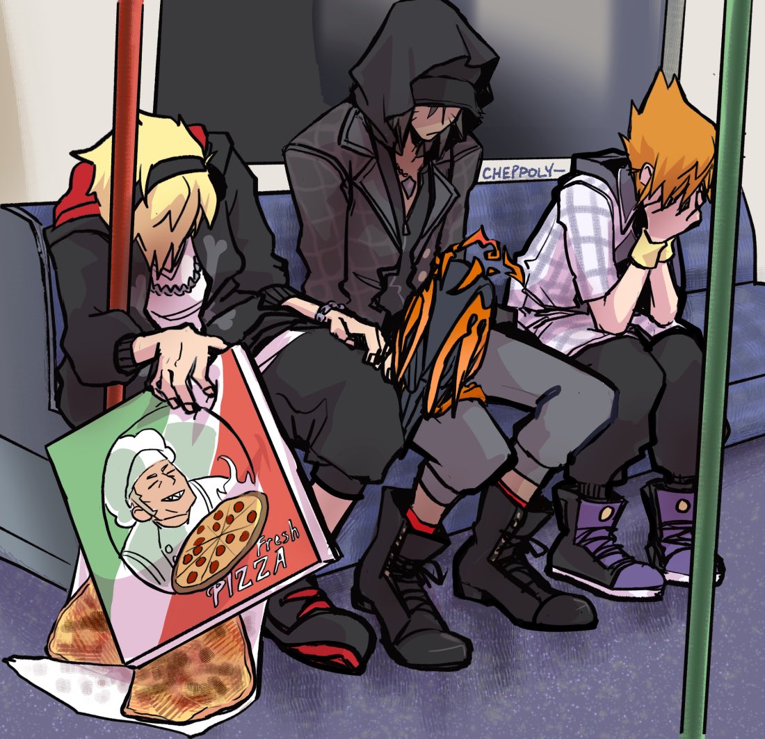 4boys animal_on_leg baseball_cap bird bito_daisukenojo black_headwear black_hoodie black_pants blonde_hair chain chain_necklace crow dark-skinned_male dark_skin facial_mark food fresh_pizza_girl_meets_raven_girl_(meme) grey_jacket hat headphones high_tops hood hooded_jacket hoodie jacket jewelry male_focus meme minamimoto_sho multiple_boys necklace orange_hair pants pizza pizza_box plaid_clothes plaid_jacket sakuraba_neku shin_subarashiki_kono_sekai shirt shoes sitting sneakers spiked_hair subarashiki_kono_sekai subway susukichi_(ntwewy) train whisker_markings white_shirt wristband