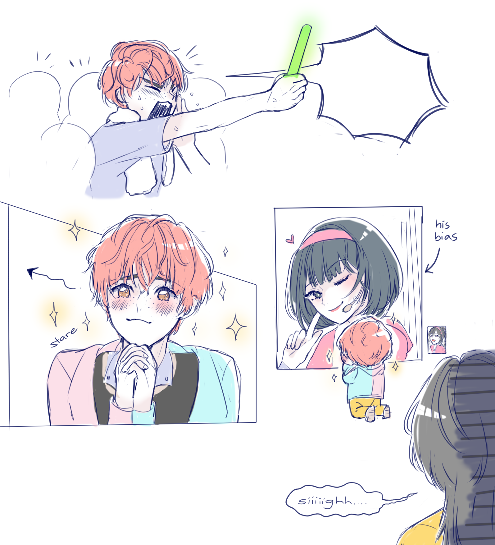 aru_fid0 black_hair blush couple earpiece english_text fan_(arufido) freckles glowing glowing_eyes glowstick hairband headband heart hetero highres holding holding_glowstick idol_(arufido) kneeling one_eye_closed original own_hands_together pink_headband poster_(object) screaming simple_background sparkle speech_bubble white_background