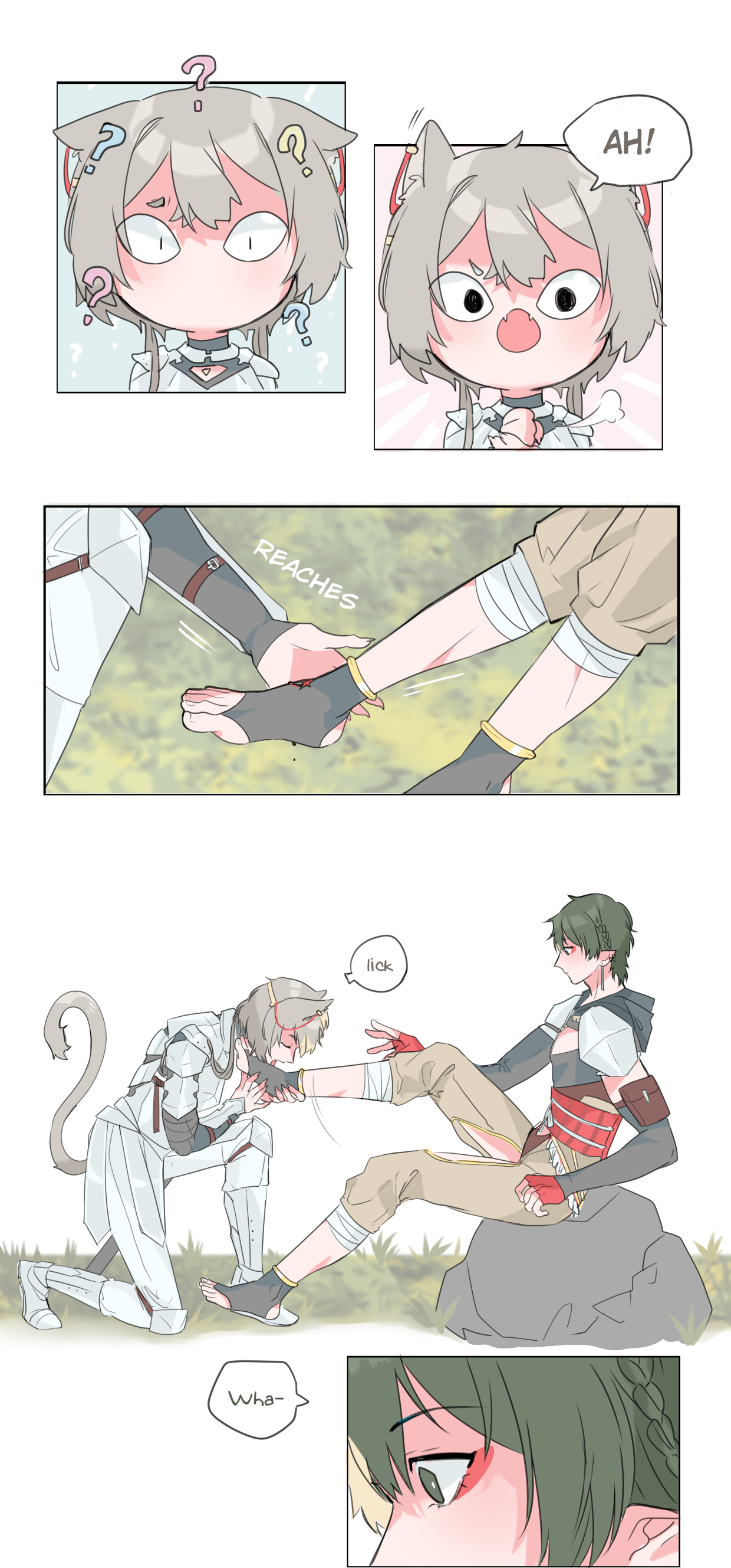 1boy 1girl absurdres animal_ears aru_fid0 arufido_(artist) assertive_female cat_ears cat_girl chibi comic couple elf english_text female_cat_knight_(arufido) femdom green_hair grey_hair hetero highres licking licking_foot male_elf_healer_(arufido) original pointy_ears short_hair speech_bubble