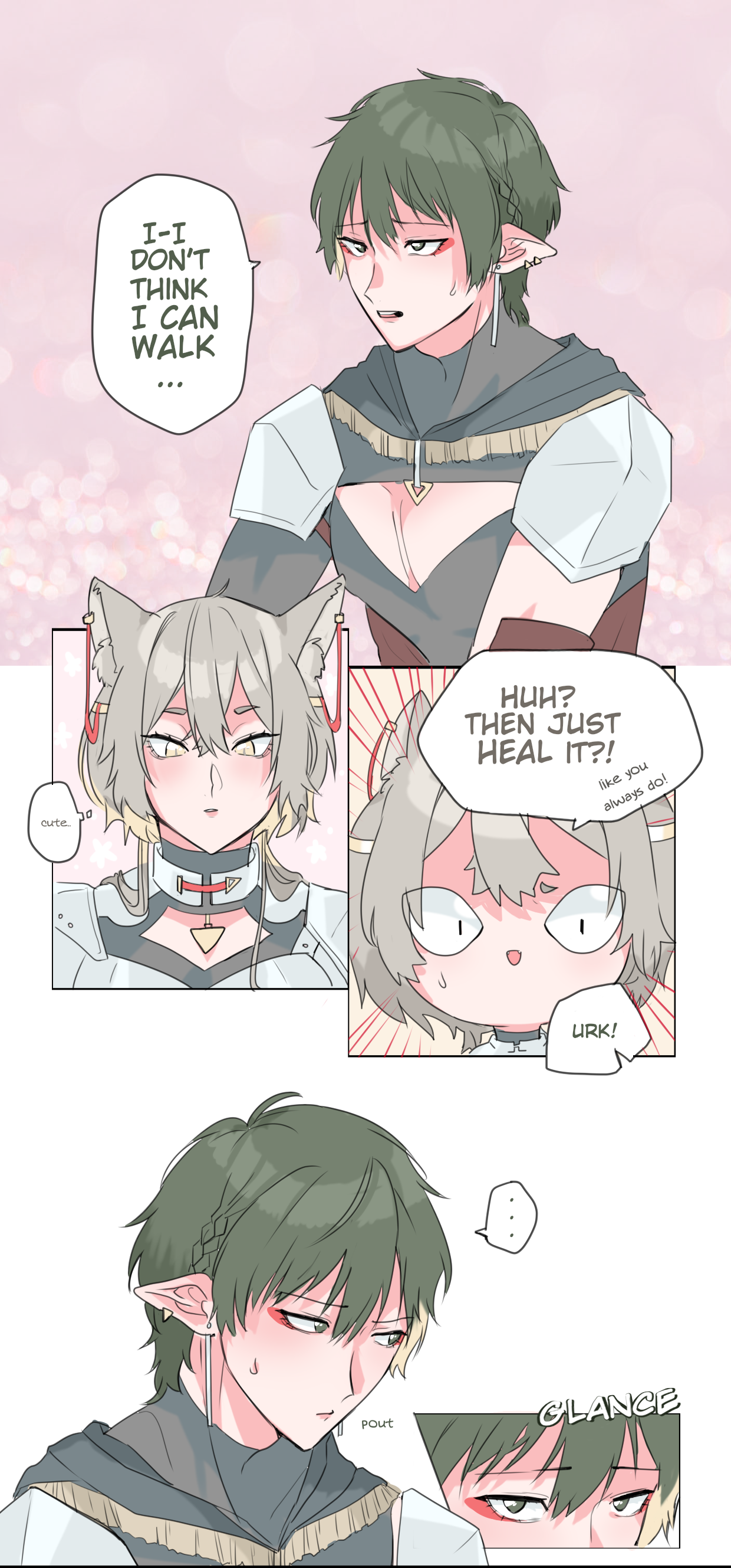 1boy 1girl absurdres animal_ears aru_fid0 arufido_(artist) assertive_female cat_ears cat_girl chibi cleavage_cutout clothing_cutout comic couple elf english_text female_cat_knight_(arufido) femdom green_hair grey_hair hetero highres male_elf_healer_(arufido) original pointy_ears short_hair speech_bubble