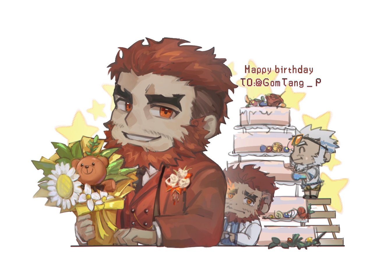 3boys aegir_(housamo) bara beard bouquet cake chibi cropped_torso dark-skinned_male dark_skin eating eyebrow_cut facial_hair flaming_eye flower food formal_clothes gift_art happy happy_birthday hephaestus_(housamo) holding holding_bouquet ladder male_focus multiple_boys official_alternate_costume protected_link red_eyes red_suit sdz_(inazuma) short_hair stuffed_animal stuffed_toy suit talos_(housamo) teddy_bear thick_eyebrows tokyo_houkago_summoners white_suit