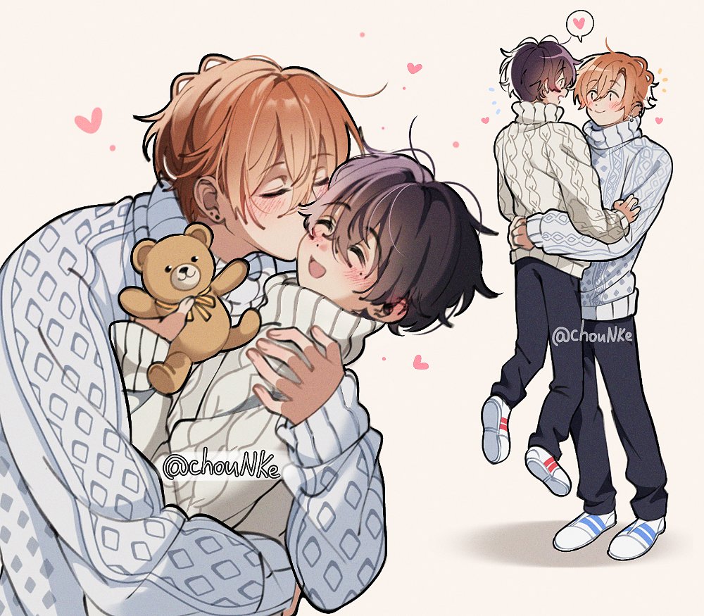 2boys black_hair black_pants blue_sweater blush chounke closed_eyes couple holding kiss kissing_cheek long_sleeves miyano_yoshikazu mole mole_under_eye multiple_boys orange_hair pants sasaki_shuumei sasaki_to_miyano short_hair sweater turtleneck turtleneck_sweater white_background white_sweater yaoi