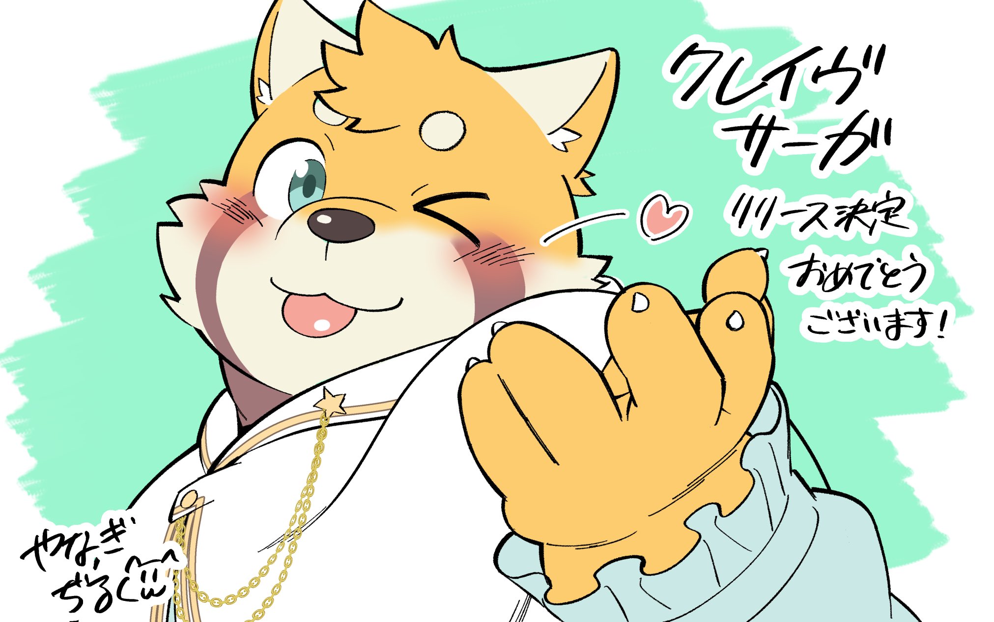 1boy :p blowing_kiss blue_shirt blush caladbolg_(crave_saga) cape chain crave_saga diru dog_boy furry furry_male green_eyes heart highres male_focus shirt simple_background star_ornament tongue tongue_out translation_request upper_body white_cape
