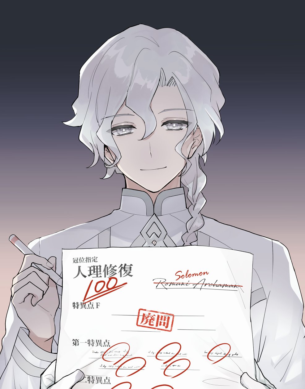 1boy amachi_(yuuin) braid curtained_hair fate/grand_order fate_(series) gloves gradient_background grey_eyes hair_between_eyes hair_over_shoulder head_tilt highres holding holding_paper holding_pen jacket long_hair looking_at_viewer male_focus marisbury_animusphere paper pen pov pov_hands purple_background romani_archaman single_braid smile solo_focus spoilers test_score upper_body white_gloves white_hair white_jacket