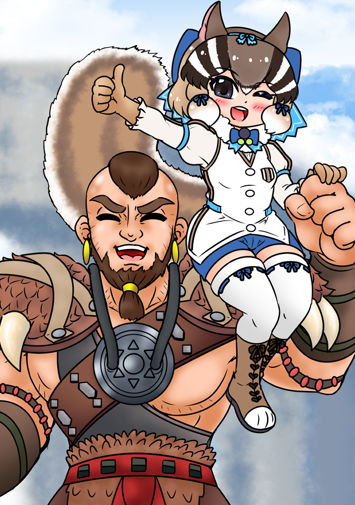 1boy 1girl animal_ears armor belt boots brown_hair chipmunk_ears chipmunk_girl chipmunk_tail edamamezooooo extra_ears gloves kemono_friends kemono_friends_v_project kneehighs lohar_(rise_of_kingdoms) microphone one_eye_closed open_mouth parody ribbon rise_of_kingdoms shirt short_hair shorts siberian_chipmunk_(kemono_friends) smile socks tail vest virtual_youtuber
