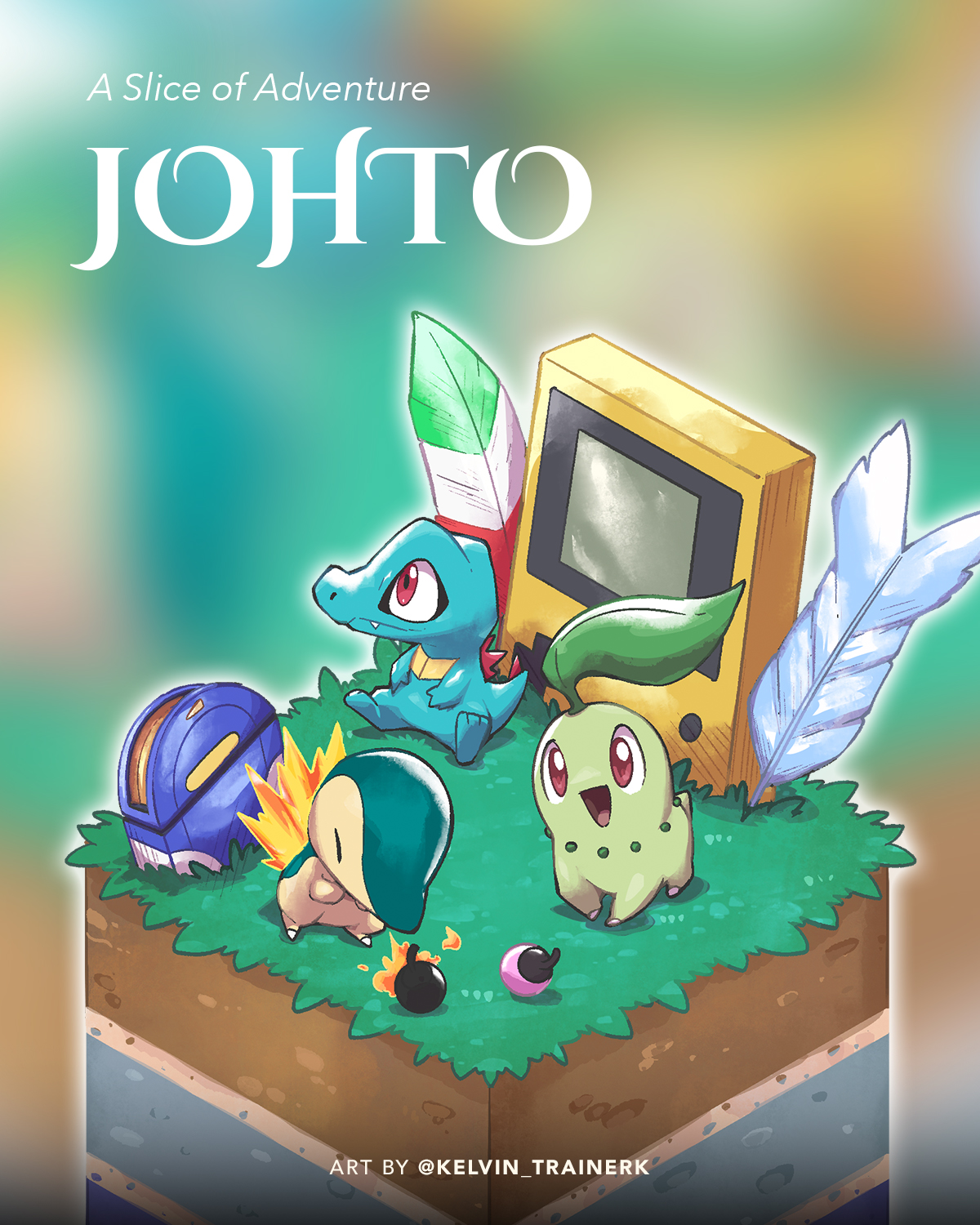 :d breath_weapon breathing_fire chikorita closed_eyes commentary cyndaquil fang fang_out fire gen_2_pokemon grass highres kelvin-trainerk nintendo no_humans open_mouth pokegear pokemon pokemon_(creature) rainbow_feather_(pokemon) red_eyes silver_feather_(pokemon) sitting smile starter_pokemon_trio totodile twitter_username watermark