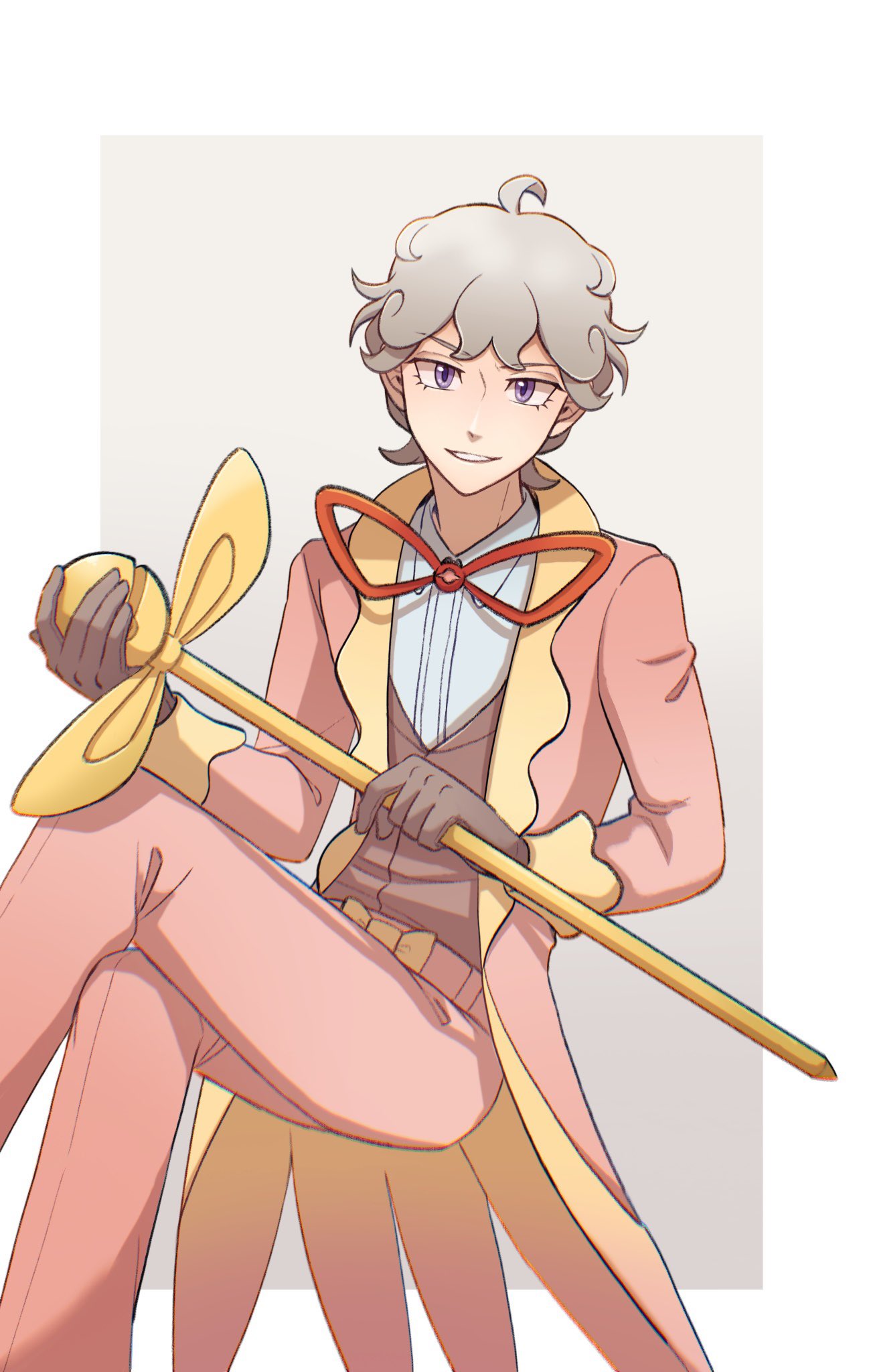 1boy ahoge bede_(pokemon) cane coat collared_shirt commentary cosplay crossed_legs curly_hair eyelashes gloves grey_hair highres holding holding_cane long_sleeves looking_at_viewer male_focus neck_ribbon nintendo open_clothes open_coat orange_ribbon ortega_(pokemon) ortega_(pokemon)_(cosplay) pants parted_lips pink_coat pink_pants pokemon pokemon_scarlet_and_violet pokemon_sword_and_shield purple_eyes ribbon shirt short_hair smile solo submashell