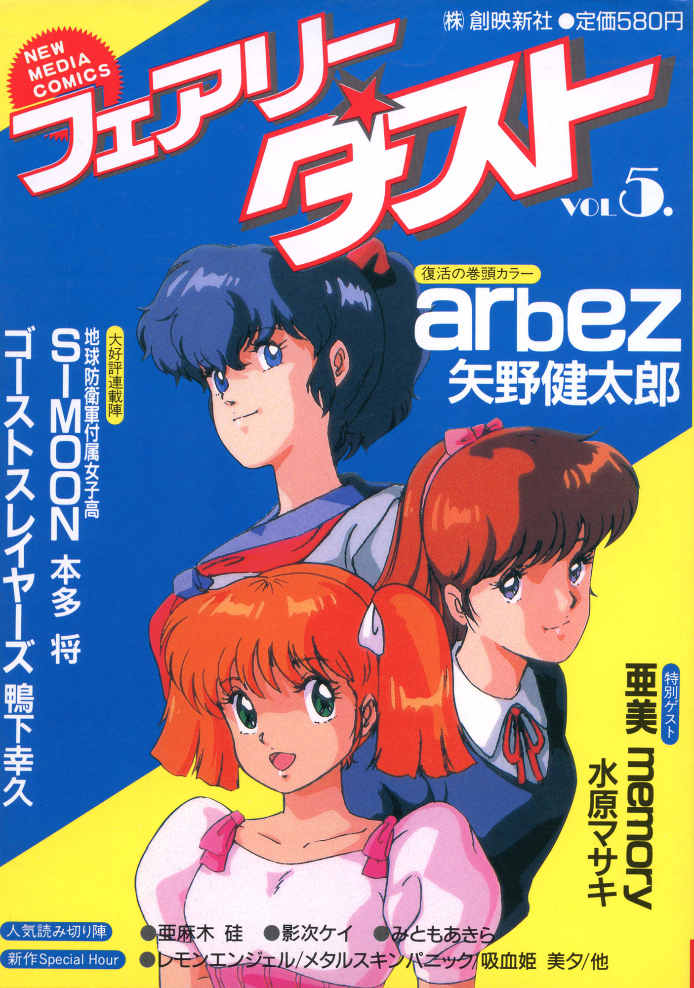 1980s_(style) 3girls blue_eyes blue_hair cover cover_page dress emoto_miki green_eyes high_ponytail highres light_smile long_hair magazine_cover medium_hair midnight_anime_lemon_angel multiple_girls non-web_source official_art oldschool open_mouth orange_hair pink_dress ponytail puffy_short_sleeves puffy_sleeves red_hair retro_artstyle sakurai_tomo scan school_uniform shima_erika short_hair short_sleeves text_focus twintails