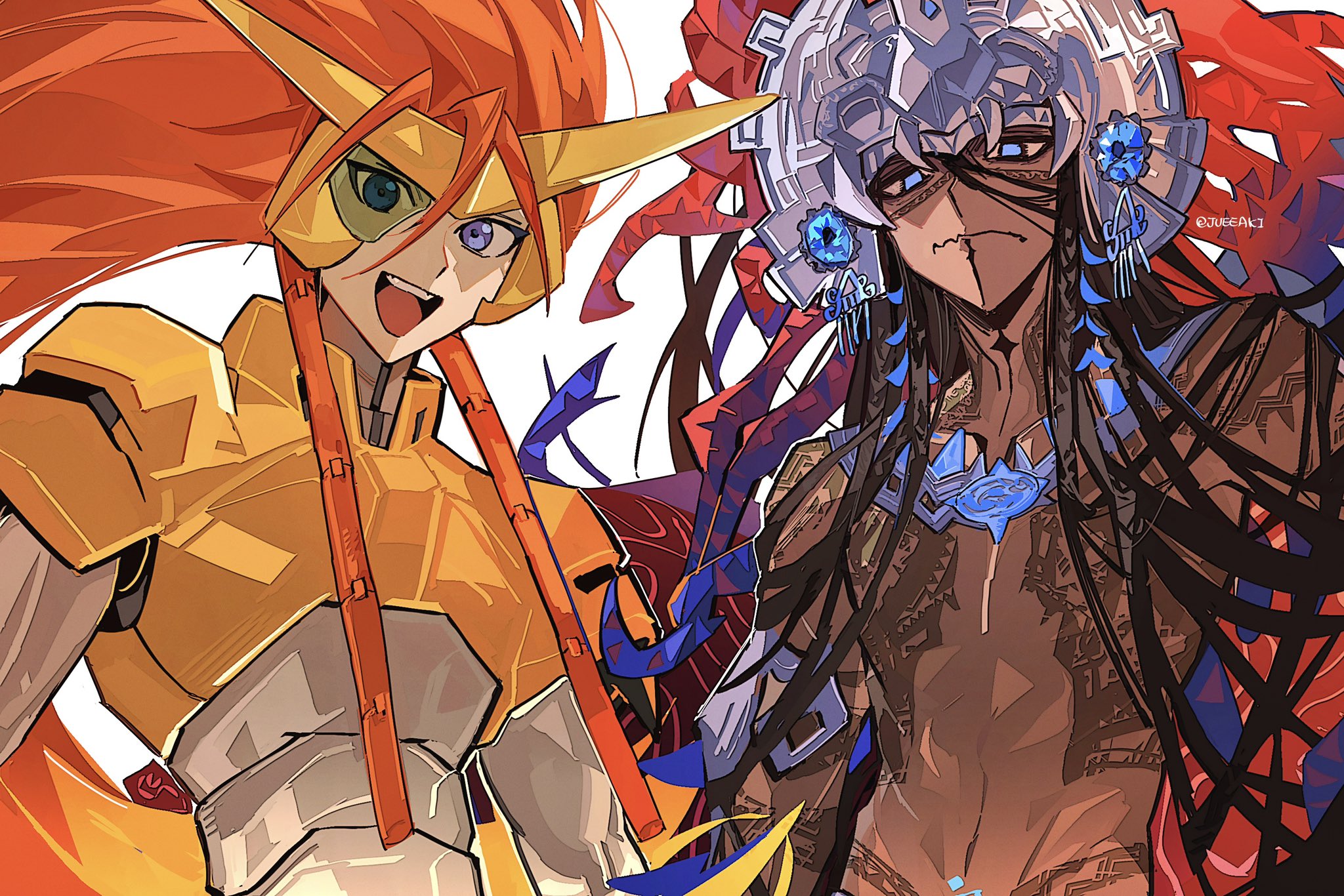2boys black_hair blue_eyes camazotz_(fate) cyborg dark-skinned_male dark_skin eeju fate/grand_order fate_(series) headdress highres hiyama_nobuyuki long_hair male_focus multiple_boys orange_hair shishiou_gai tattoo twitter_username voice_actor_connection white_background yuusha_ou_gaogaigar yuusha_series